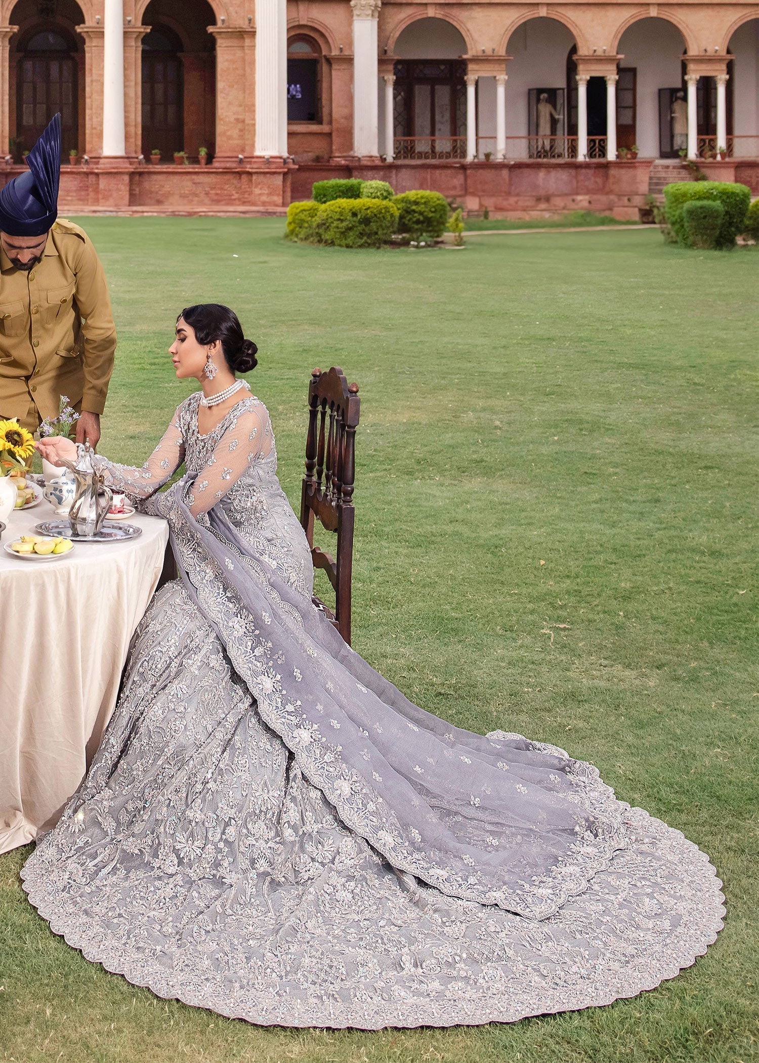 Experience the perfect fusion of timeless elegance and modern allure with this exquisite grey mermaid cutline ensemble. Featuring a stunning shirt, lehenga, and dupatta, this outfit showcases a seamless blend of classic charm and contemporary beauty. The net shirt is intricately hand-embellished with shimmering silver work, complemented by delicate hues of blues and pinks, creating a captivating and refined effect. Paired with a trail lehenga adorned with lavish embellishments, the ensemble exudes sophistication and grace. The net dupatta, with its heavy border embellishments of pearls and a sparkling sitara spray, adds a final touch of opulent glamour. Ideal for making a striking impression at any special occasion, this outfit promises to envelop you in unmatched elegance and style.