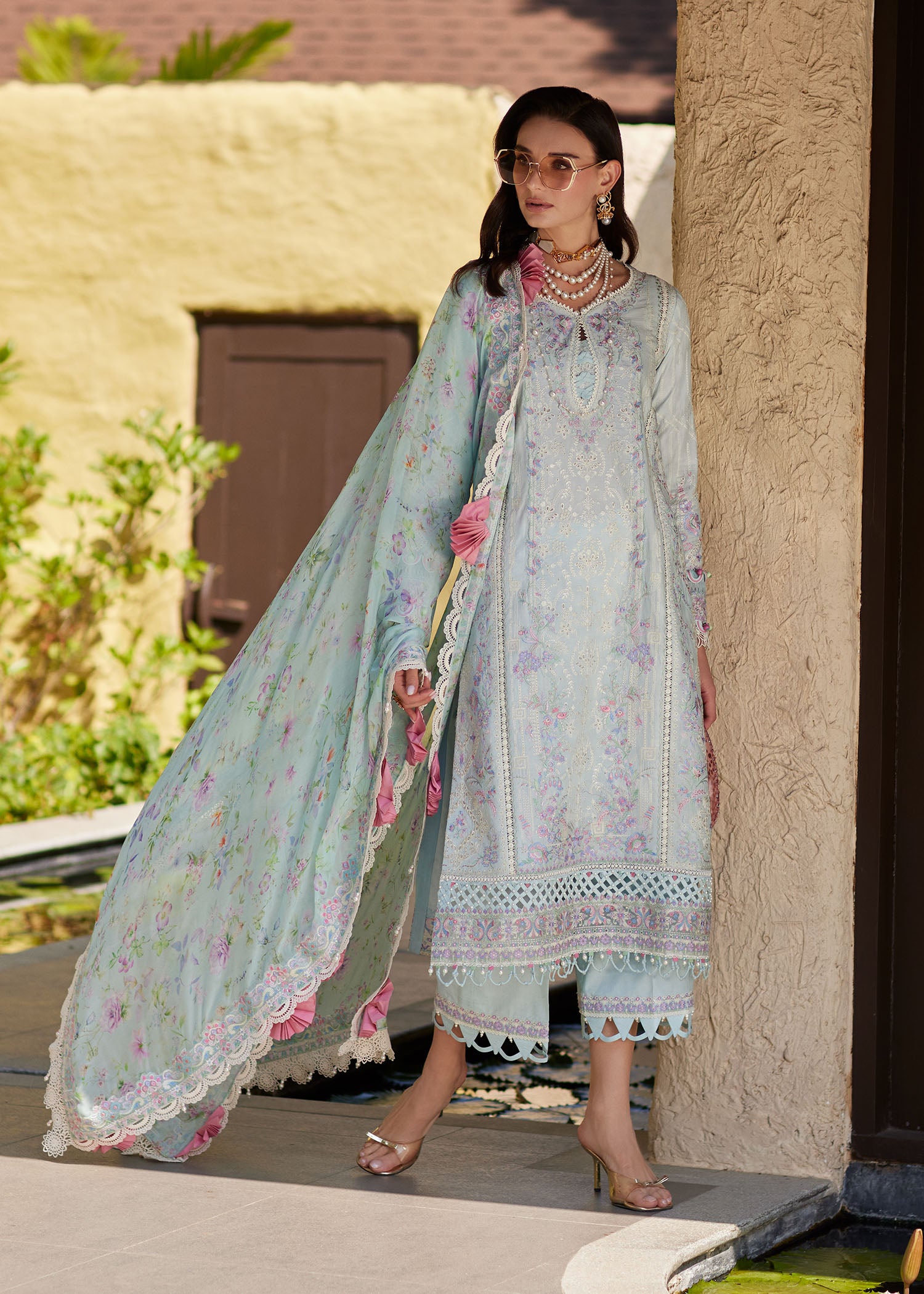 A vision of soft elegance, this powder blue ensemble is adorned with delicate prints and fine embroidery, creating a fresh and feminine allure. Paired with an airy chiffon dupatta featuring graceful floral motifs and subtle embroidered details, and finished with a comfortable cambric trouser, it is a timeless choice for daytime festivities and refined summer gatherings.