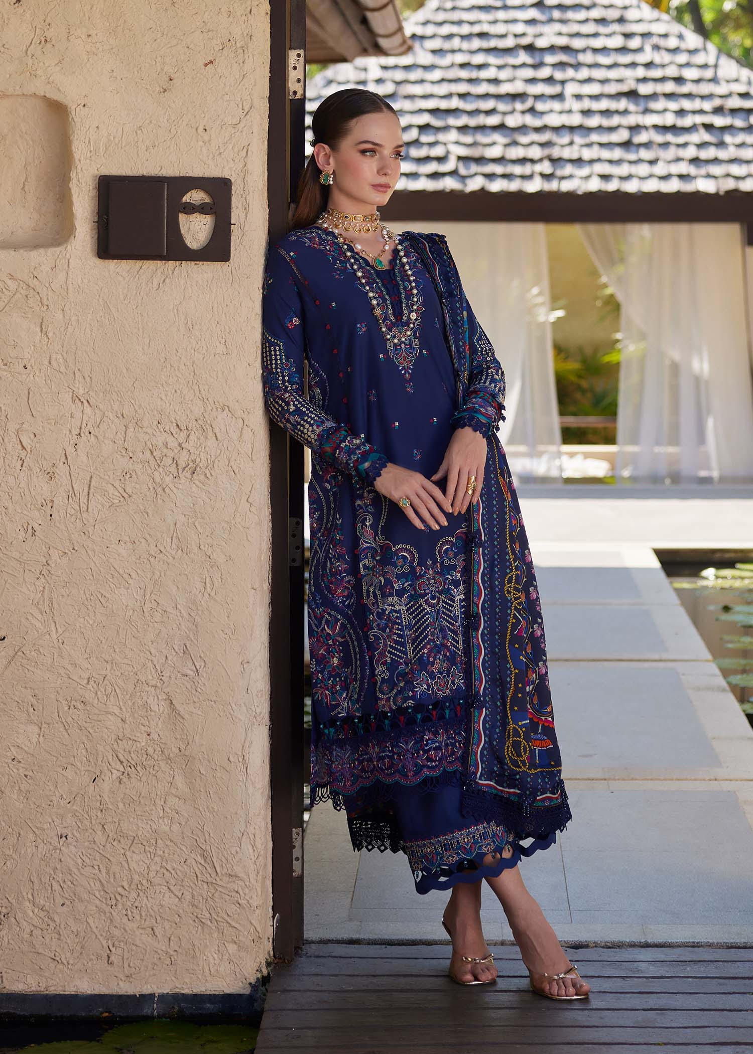 Exude timeless elegance with this striking navy blue ensemble from our luxury lawn collection, crafted to blend meticulous craftsmanship with contemporary sophistication. The unstitched embroidered lawn shirt features intricate, multi-colored threadwork across the front, creating a refined and luxurious silhouette. Paired with a printed silk dupatta, the ensemble is elevated with fluid grace and a subtle lustrous finish. Completed with matching cambric trousers, this set combines intricate detailing with modern elegance, making it a perfect choice for festive and elevated daytime occasions.