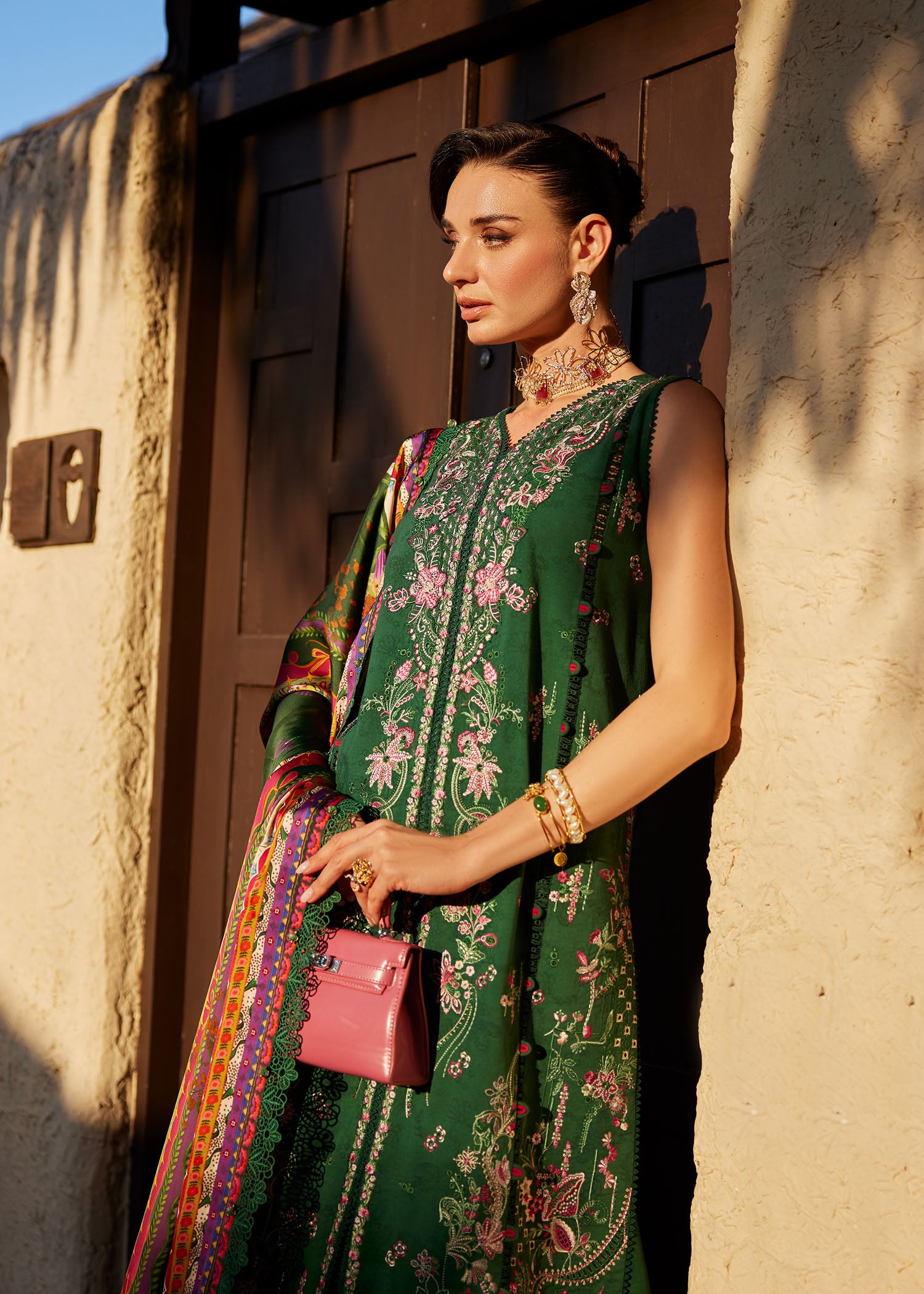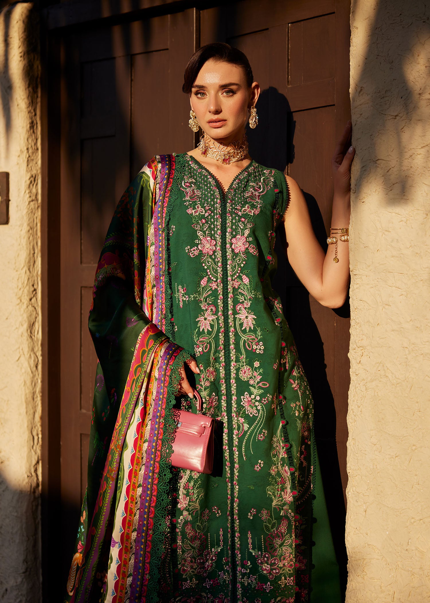 Step into the season with this luxurious emerald green ensemble from our premium lawn collection. The front-open lawn shirt is a true testament to craftsmanship, featuring dense floral embroidery in shades of magenta and blush, enhanced by delicate lace inserts that highlight its elongated, structured silhouette. Paired with a printed silk dupatta, the look gains fluid sophistication and a subtle sheen, elevating the ensemble’s elegance. Completed with matching azar pants adorned with a finely embroidered hem border, this outfit beautifully balances intricate detailing with modern refinement, making it a standout choice for festive and elevated daytime occasions.