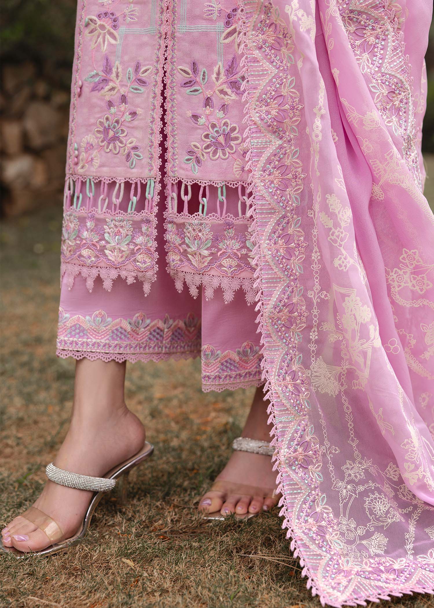 Turn heads with this gorgeous three-piece pastel pink lawn outfit, expertly crafted to blend elegance and sophistication. Featuring a beautifully embroidered jacquard open shirt with delicate lace details that enhance its graceful silhouette, paired with stylish cambric cigarette pants adorned with intricate embroidery and fine stitching for a perfect blend of comfort and style. The ensemble is completed with a lightweight chiffon dupatta, showcasing a tasteful screen print and finished with an embroidered border and lace trim, giving it a light and airy movement that perfectly complements the season. With its intricate details and lovely pink hue, this outfit is designed to bring a touch of refinement and poise to your daily attire, making it suitable for a variety of occasions.
