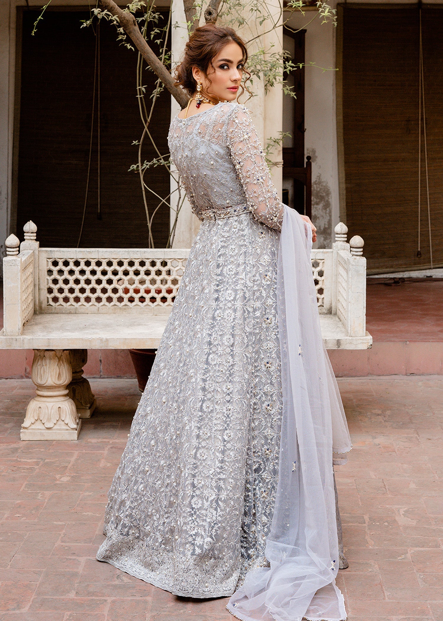 It is a 4 piece stitched outfit including gown, lehnga, dupatta and belt. It is in grey color but can be customised in any color. Fabric for gown is pure net. It has embroided base all over the shirt with hand embellishment on front, back and sleeves. Jamavar is used as lower. It is embellished from front only. Dupatta is in pure net with hand embellished spray all over it. It is paired with embellished belt.