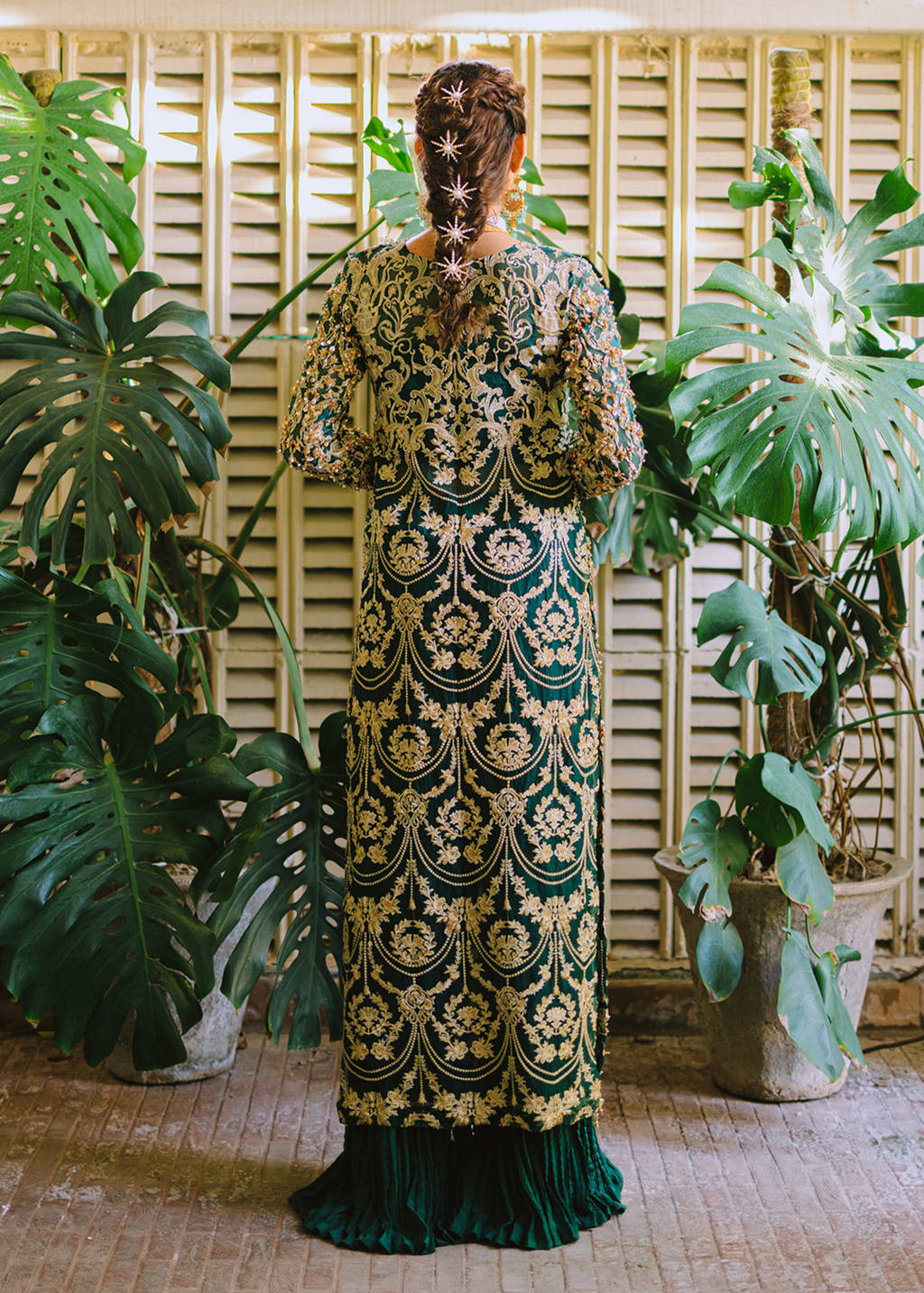 For those who love to wear bold colors, along with a striking look, “Shabnami” is the perfect design for you. This elegant dress features an organza base, delicately rendered floral motifs with jewel like pattern on a hue of green. The gold embellishments make the outfit very attractive and are paired with crushed pants.