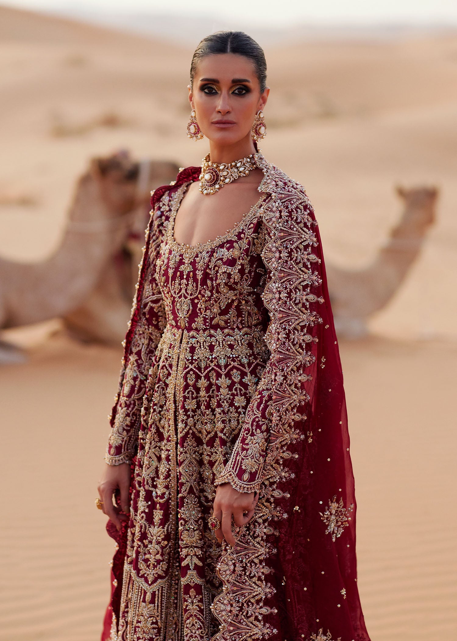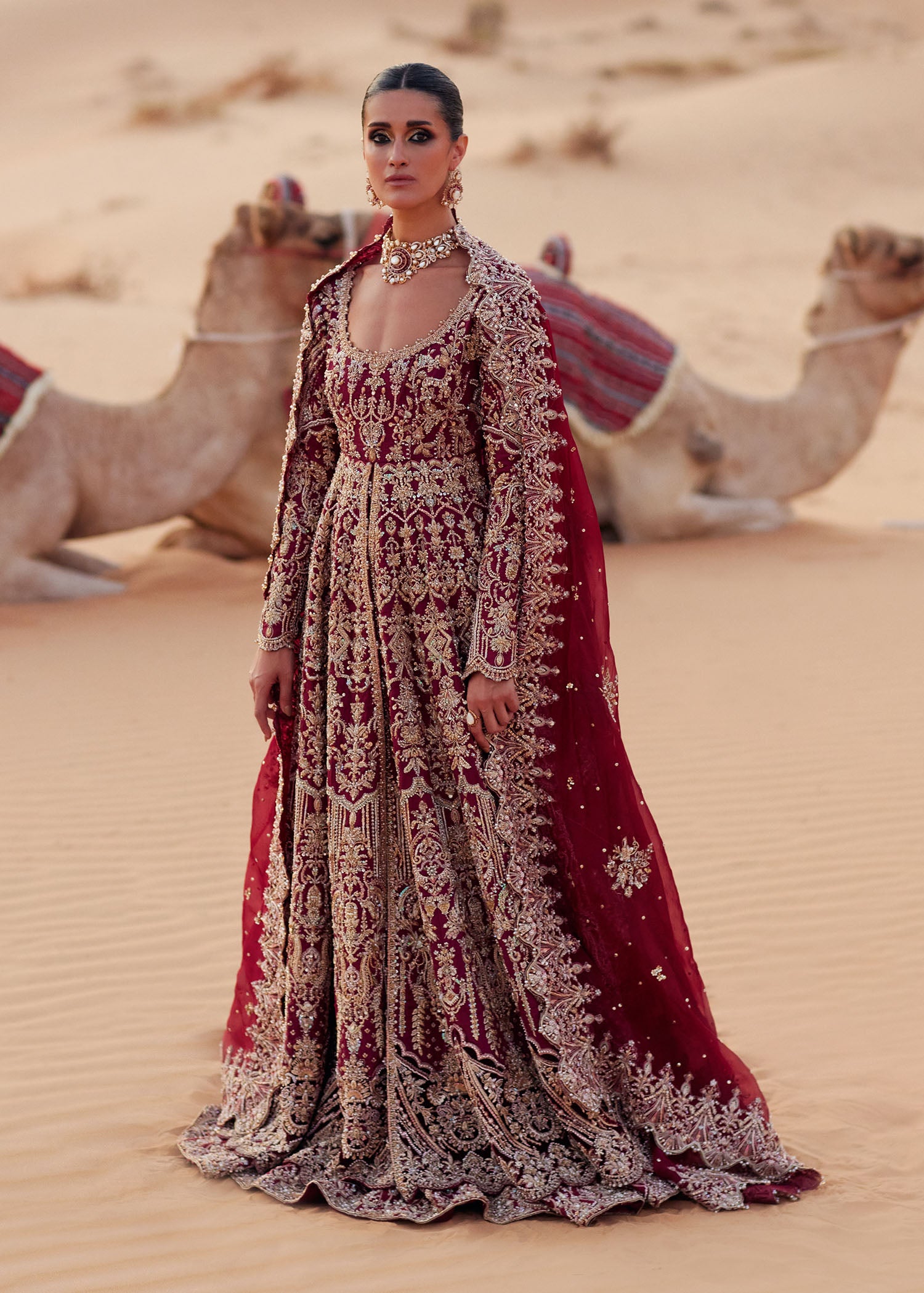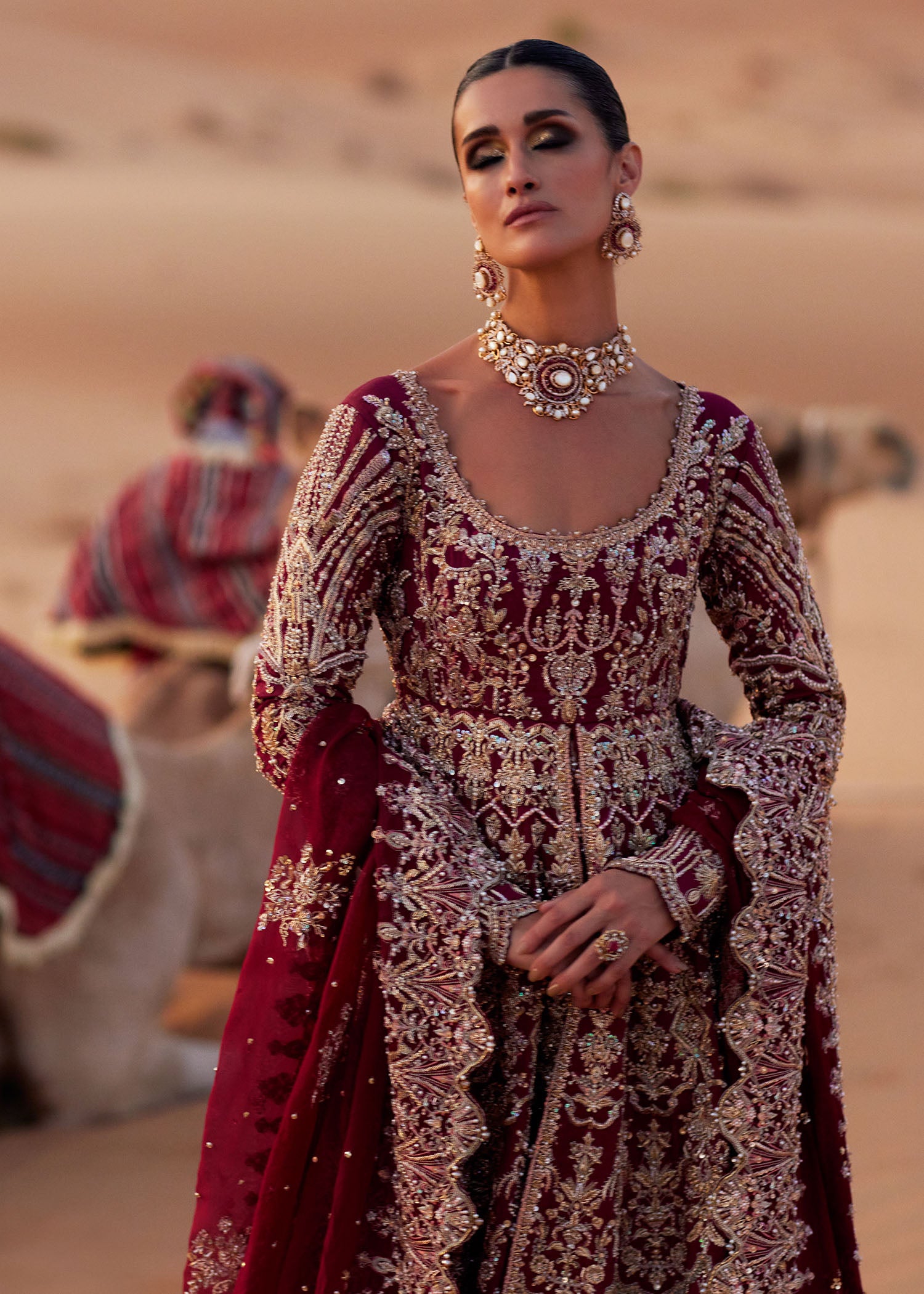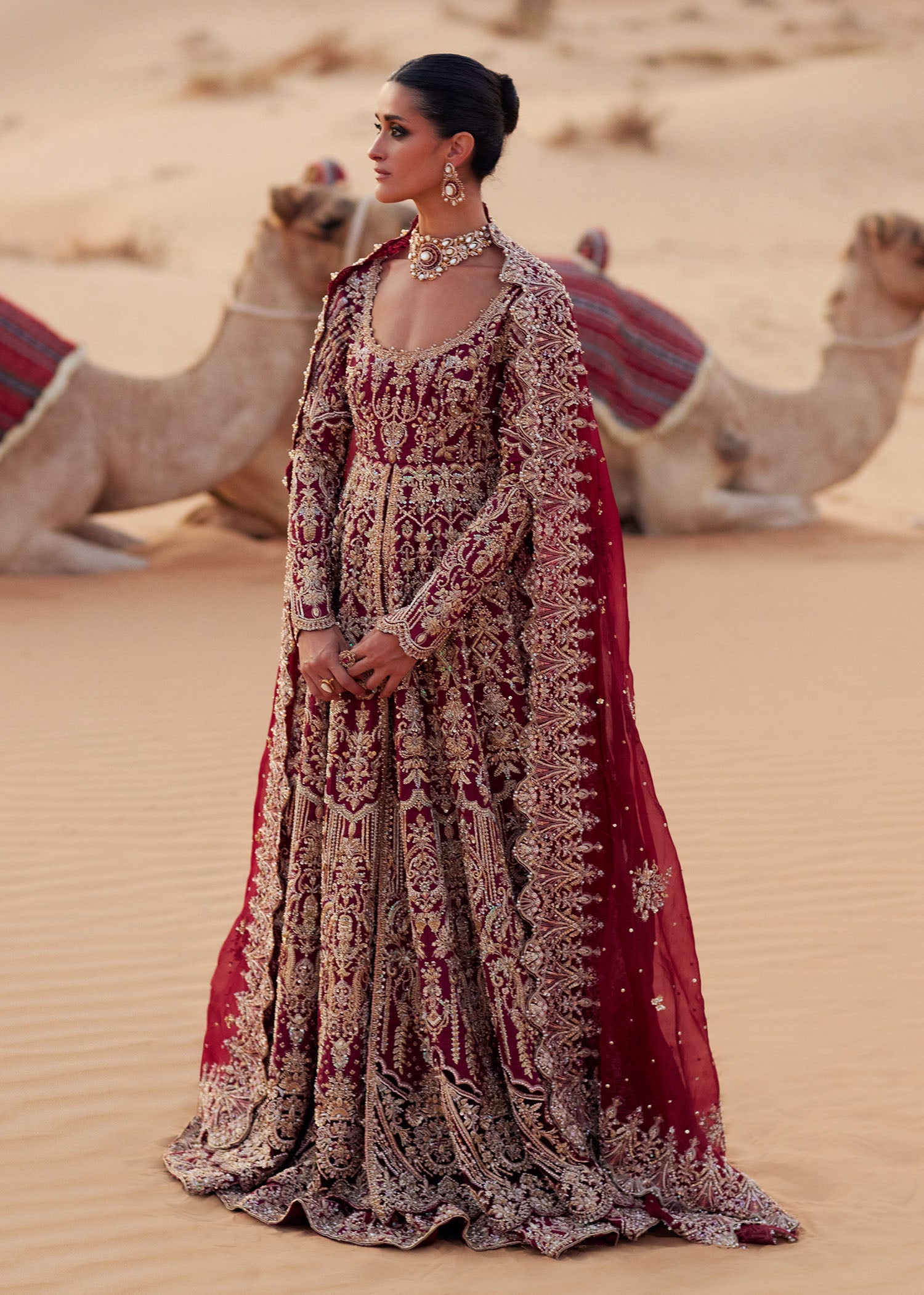 Arisa where crimson dreams meet royal splendor. A regal red gown paired with a flowing lehnga in luxurious raw silk, finished with a sheer organza dupatta for effortless grace. Velvet accents and layered gold embellishments shimmer in perfect harmony, creating depth, drama, and timeless bridal elegance. Designed for the bride who commands sophistication with quiet grandeur.
