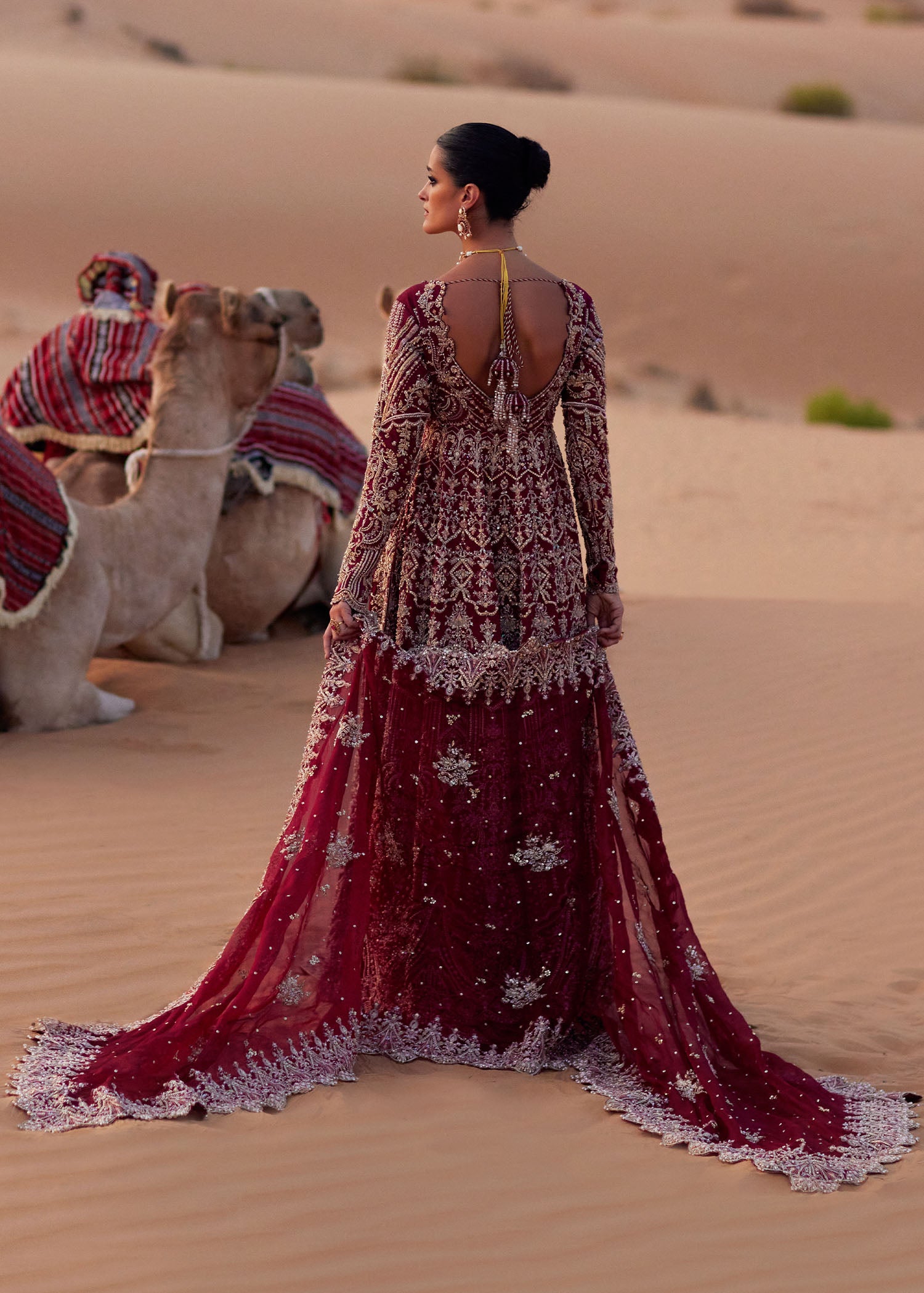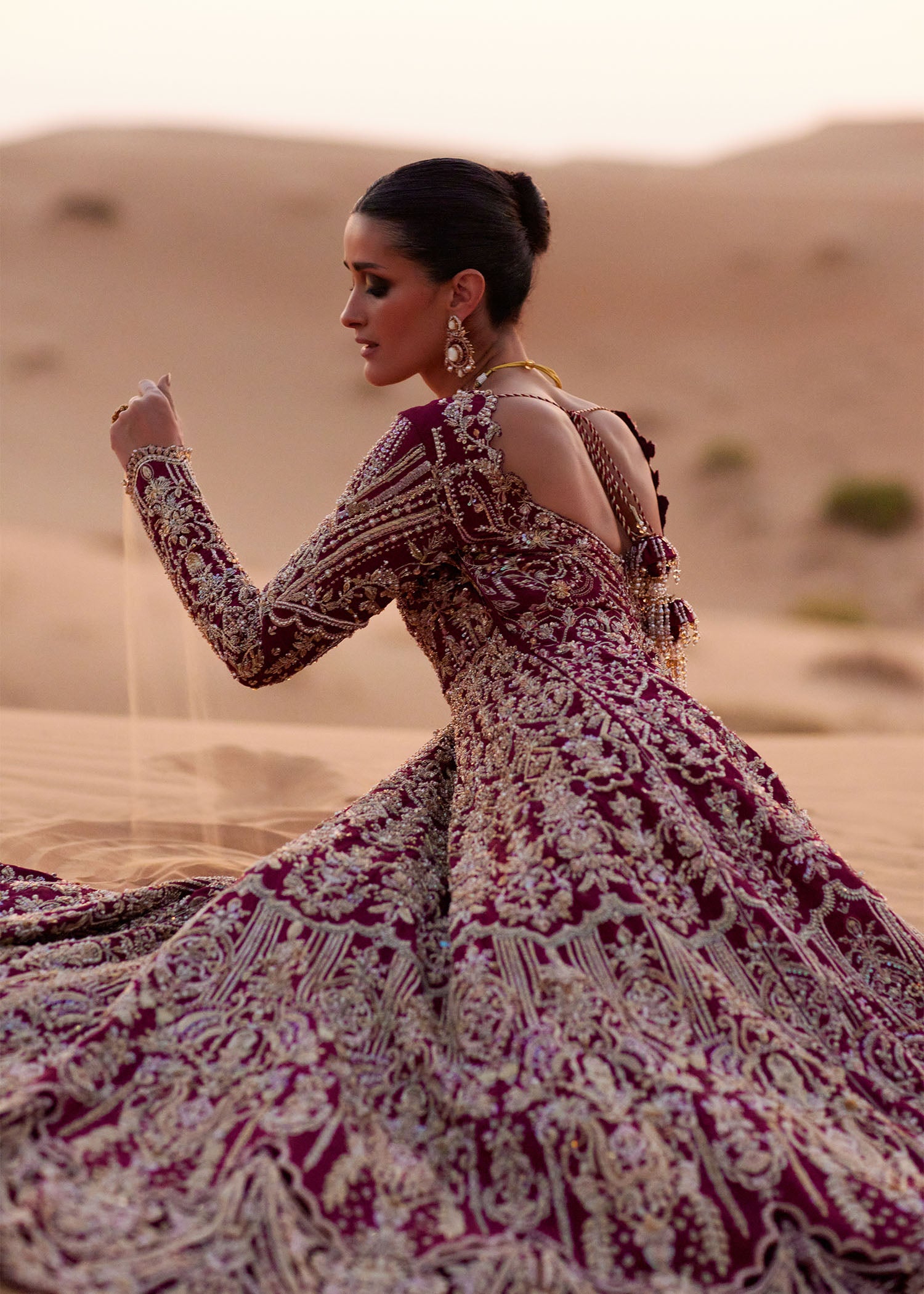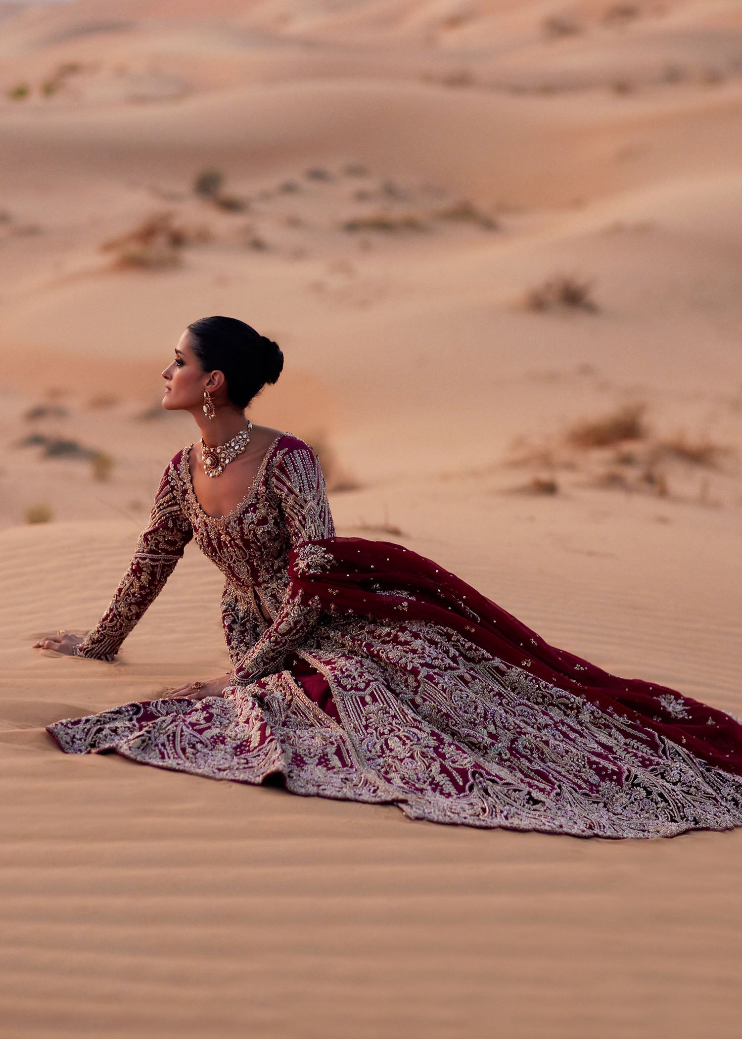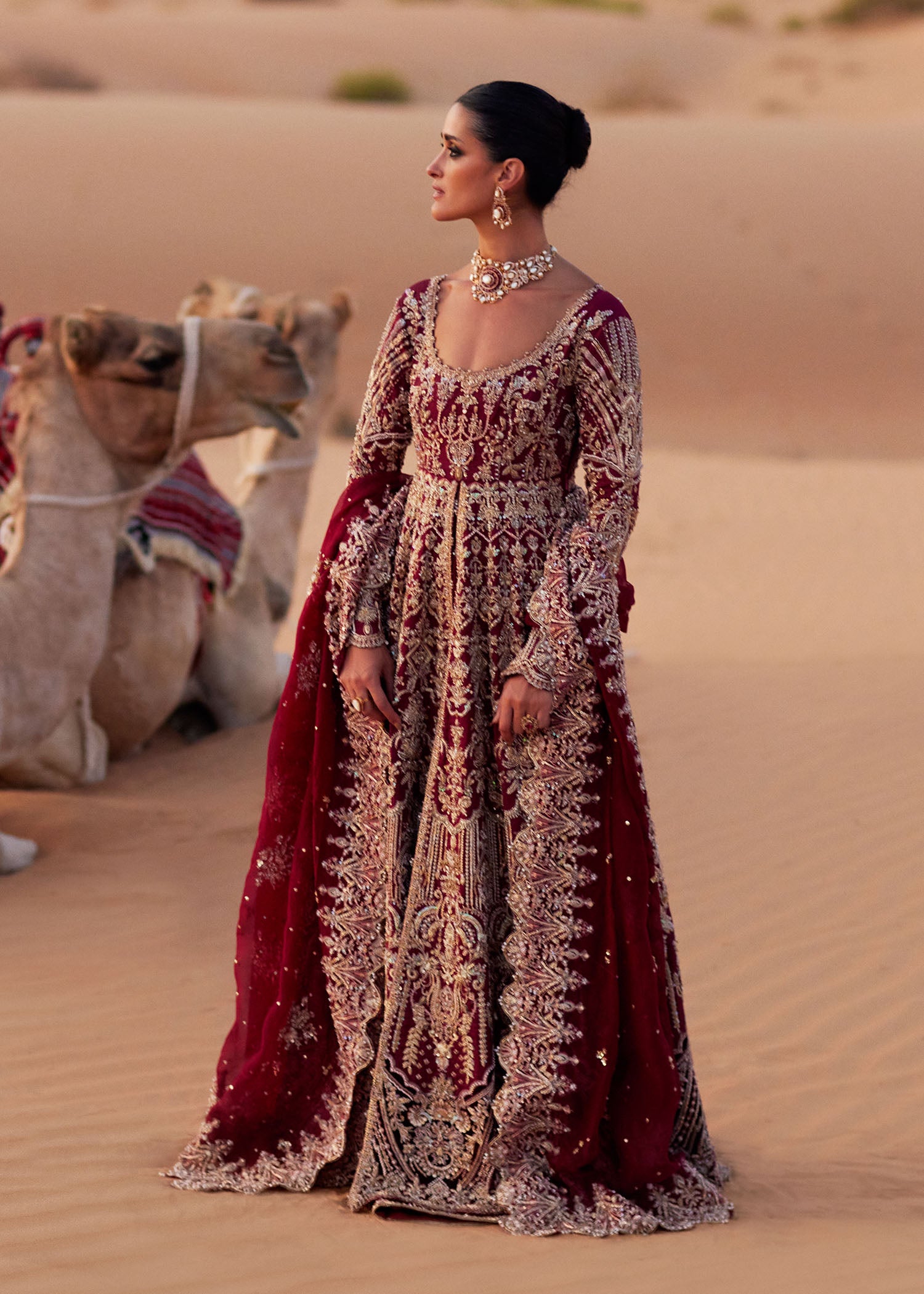 Arisa where crimson dreams meet royal splendor. A regal red gown paired with a flowing lehnga in luxurious raw silk, finished with a sheer organza dupatta for effortless grace. Velvet accents and layered gold embellishments shimmer in perfect harmony, creating depth, drama, and timeless bridal elegance. Designed for the bride who commands sophistication with quiet grandeur.