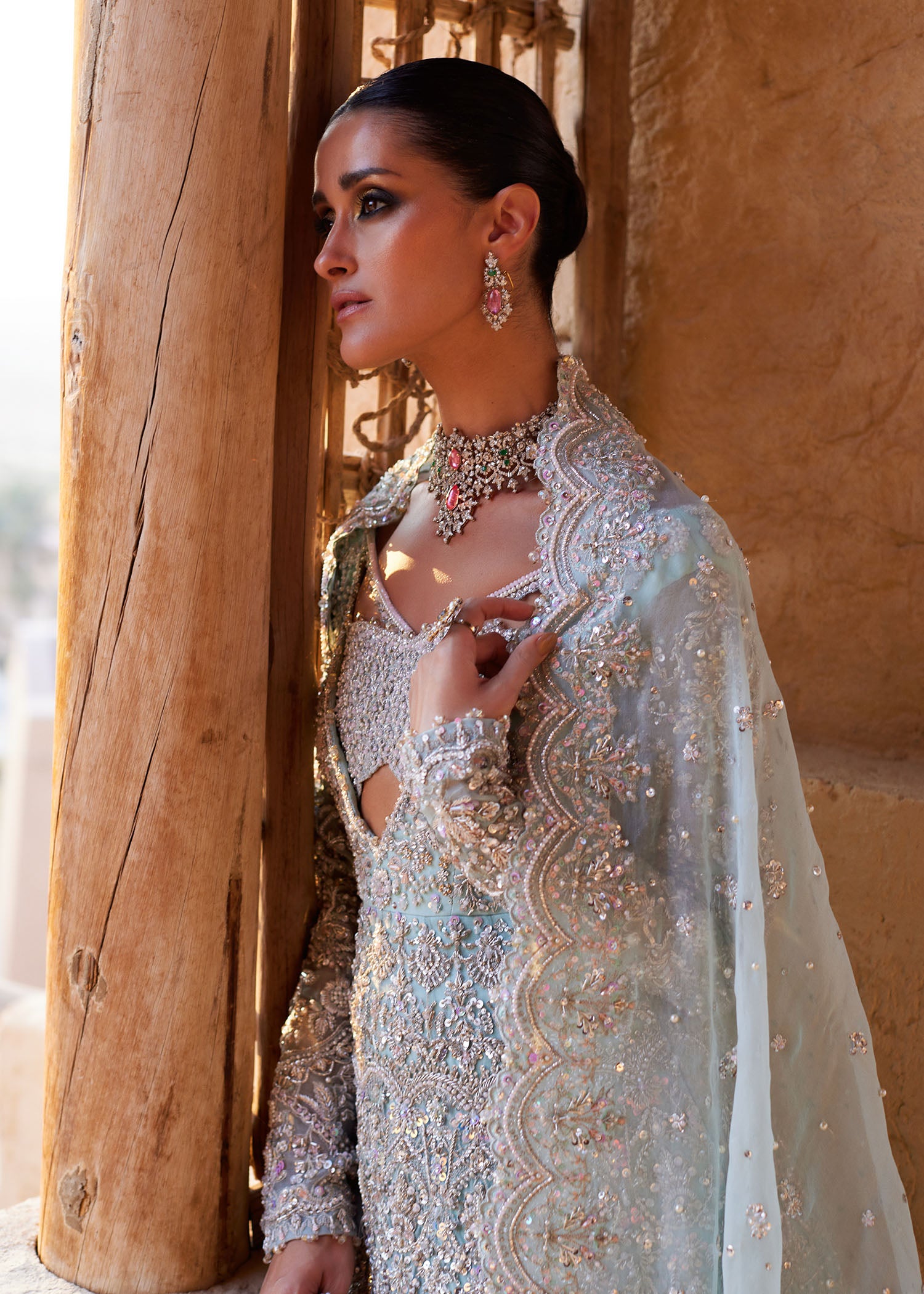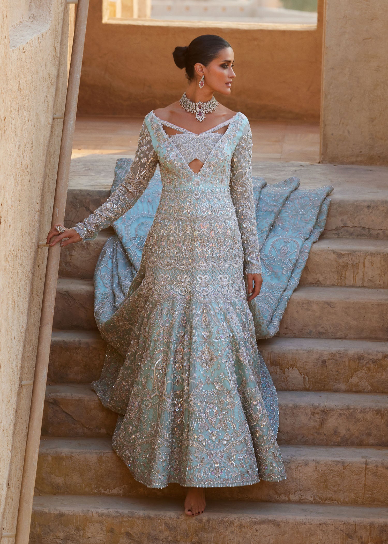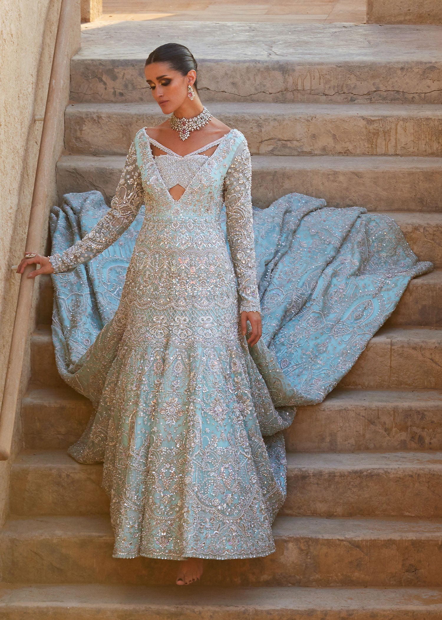 Aylin is a vision born of frost and light, crafted in ice-blue organza and shaped into a soft mermaid silhouette that flows into a dramatic, regal trail. Adorned with luminous silver handwork and subtle pastel accents, the gown is paired with a matching dupatta to enhance its ethereal allure. Aylin captures modern bridal elegance through refined detailing and a dreamy, couture-inspired finish.