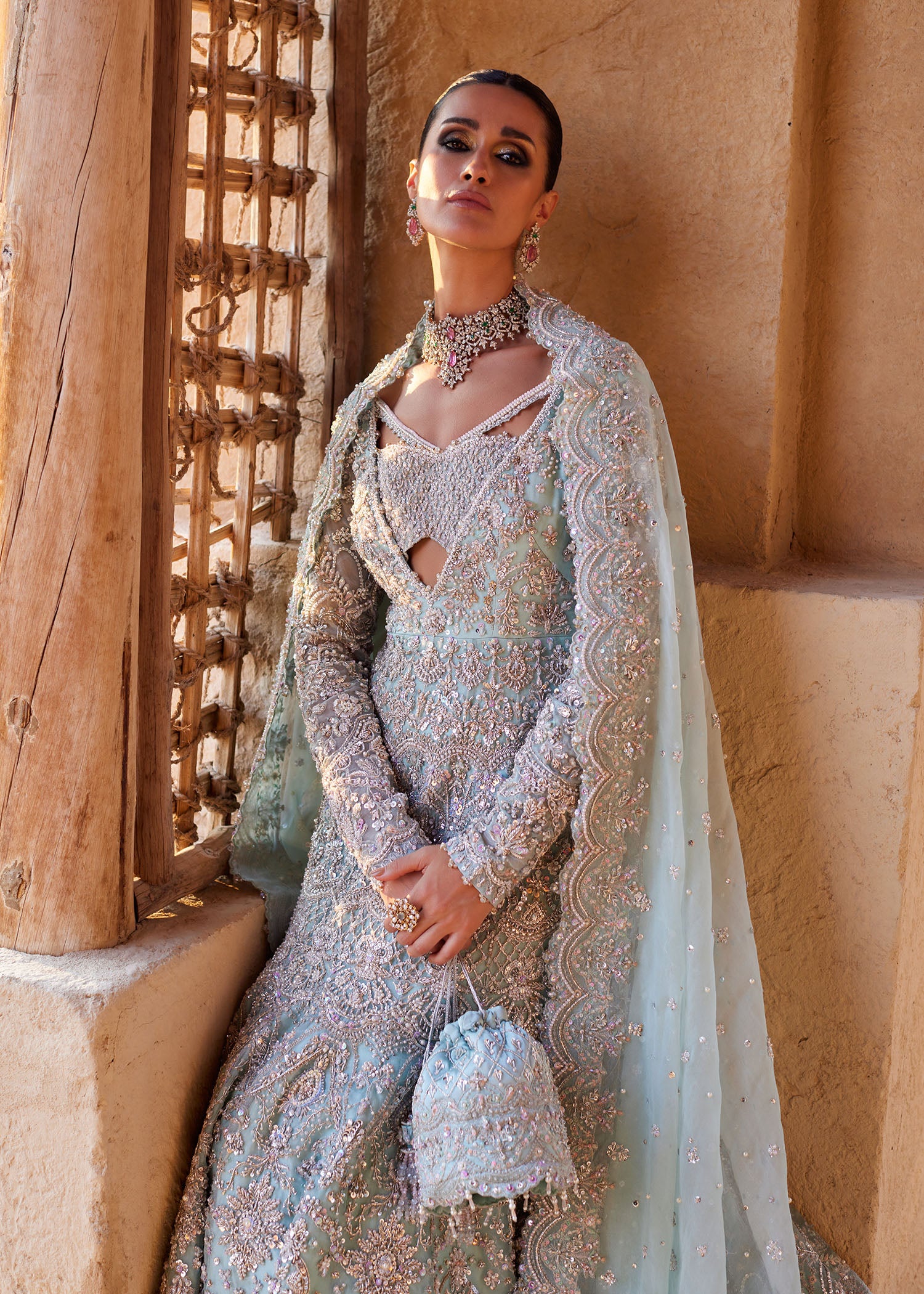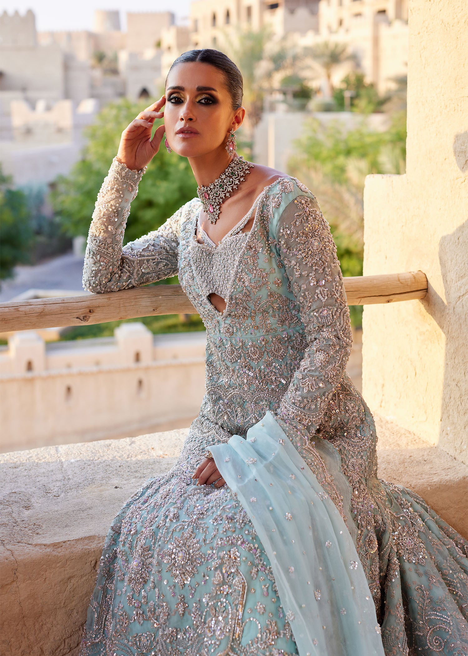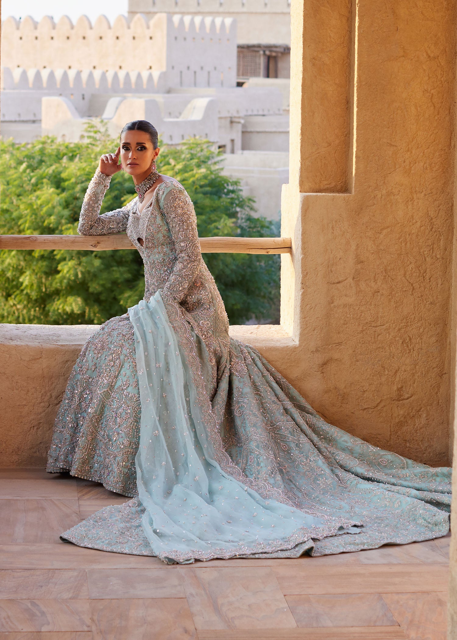 Aylin is a vision born of frost and light, crafted in ice-blue organza and shaped into a soft mermaid silhouette that flows into a dramatic, regal trail. Adorned with luminous silver handwork and subtle pastel accents, the gown is paired with a matching dupatta to enhance its ethereal allure. Aylin captures modern bridal elegance through refined detailing and a dreamy, couture-inspired finish.