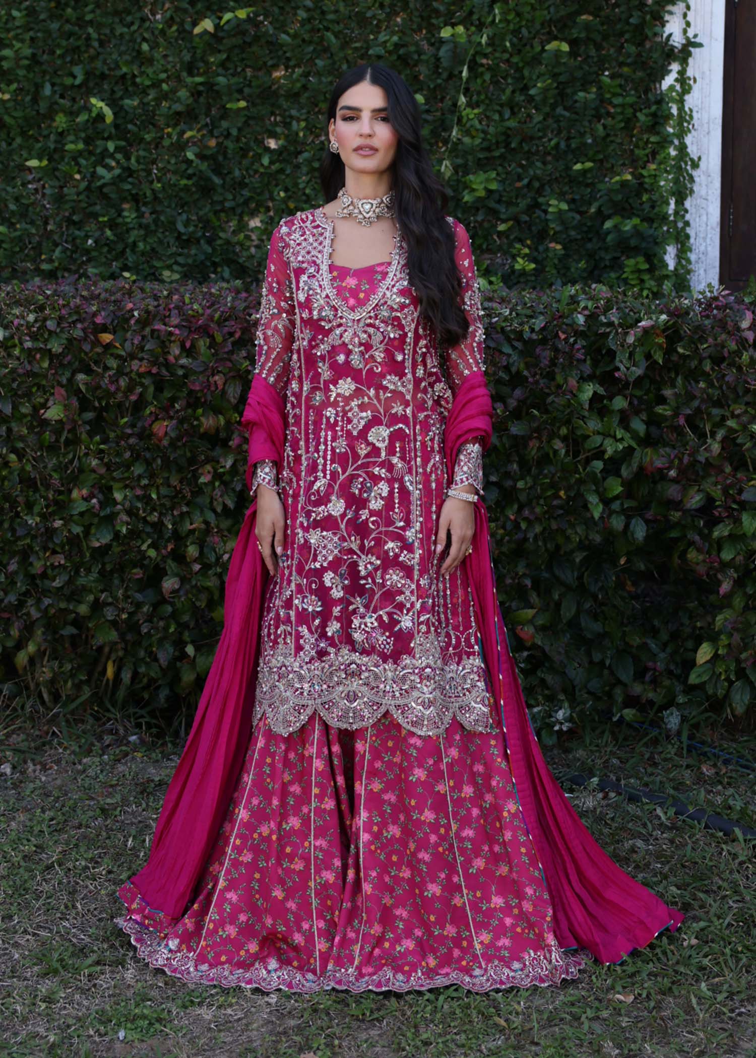 This vibrant shocking pink seamless shirt is a bold expression of modern elegance, featuring a clean, fluid silhouette that exudes effortless sophistication. Paired with a beautifully printed sharara pant and a coordinated printed camisole, the ensemble offers movement, depth, and a refined layered appeal. The look is completed with a crushed dupatta delicately adorned with light gold embroidery, adding a soft, luxurious glow. A harmonious blend of striking color and thoughtful detailing, this outfit is perfect for festive gatherings, daytime events, and statement celebrations.