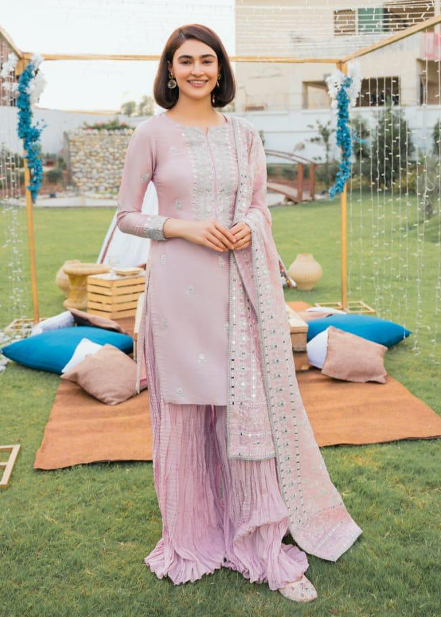 Designed with an enchanting shade of pink, Mehrmaa comes with a charming Korean silk shirt adorned with dazzling sheesha work and eye catching sequins, as well as intricate embroidery and gold tilla work on the neckline which appeals to the senses.This outfit comes with crushed pants that create a dramatic flair and an embroidered cotton net dupatta with a 4-sided border delicately made with lace.