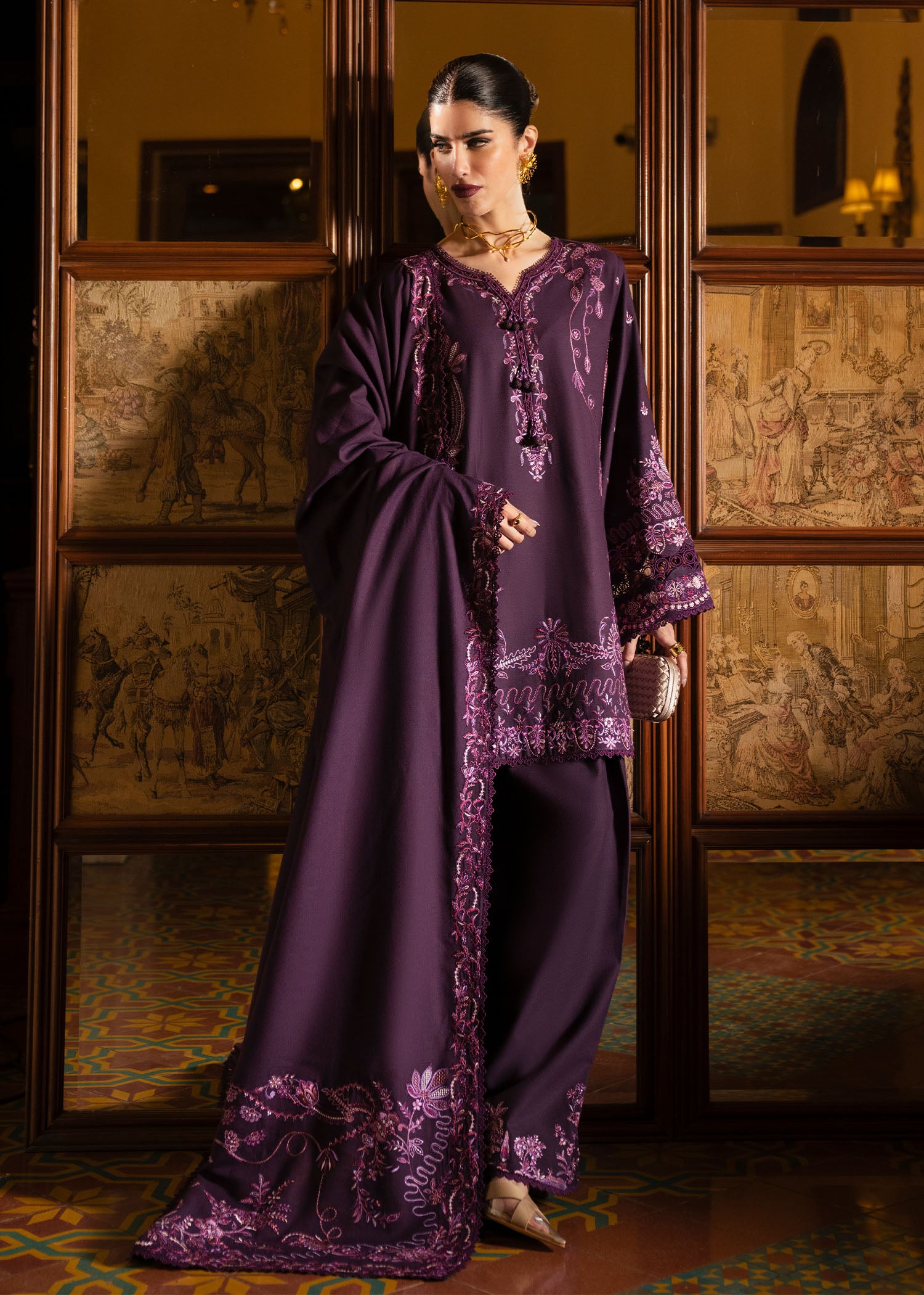 Step into effortless elegance with this rich plum karandi ensemble, featuring a short shirt with a graceful round daman, adorned with intricate self-tone embroidery for a subtle yet sophisticated appeal. The look is paired with a beautifully embroidered farshi shalwar, adding traditional charm and gentle volume to the silhouette. A coordinating karandi embroidered dupatta completes the outfit, making it an ideal choice for refined winter soirées or intimate festive gatherings.