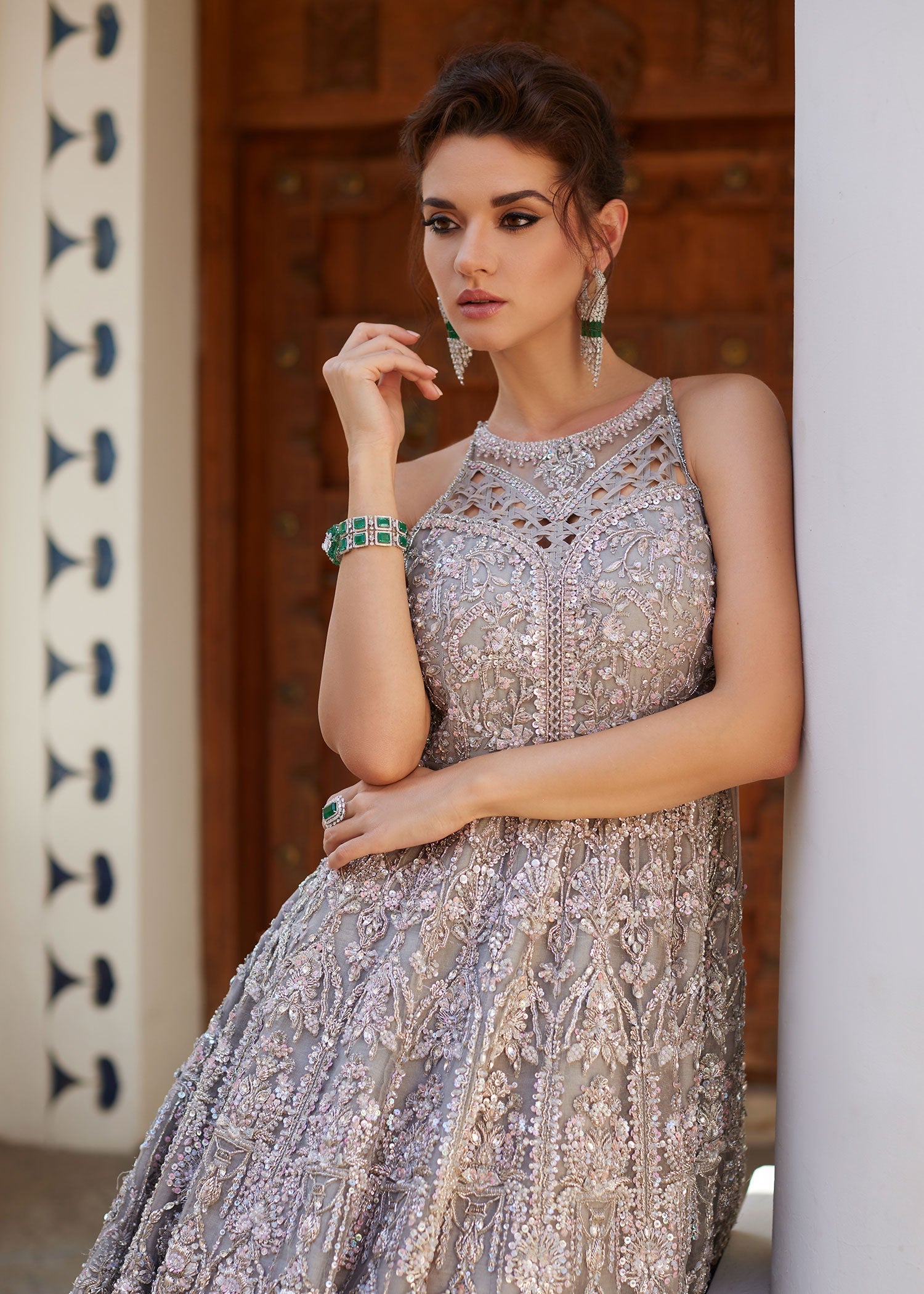 A stunning blend of contemporary sophistication and intricate craftsmanship. This breathtaking grey organza bridal gown features a chic halter neck, creating a structured, graceful silhouette that exudes timeless elegance. The exquisite check design stitching along the neckline adds texture and depth, highlighting the bride's shoulders with delicate precision. The gown’s dramatic flare is composed of voluminous layers of ethereal organza, cascading in soft, airy waves for a romantic, ethereal effect. Silver embellishments on the bodice shimmer with every step, elevating the gown's refined beauty. Paired with a matching embellished dupatta, adorned with intricate silver detailing, Ravina offers a cohesive and opulent bridal look, designed to make an unforgettable statement on your special day.