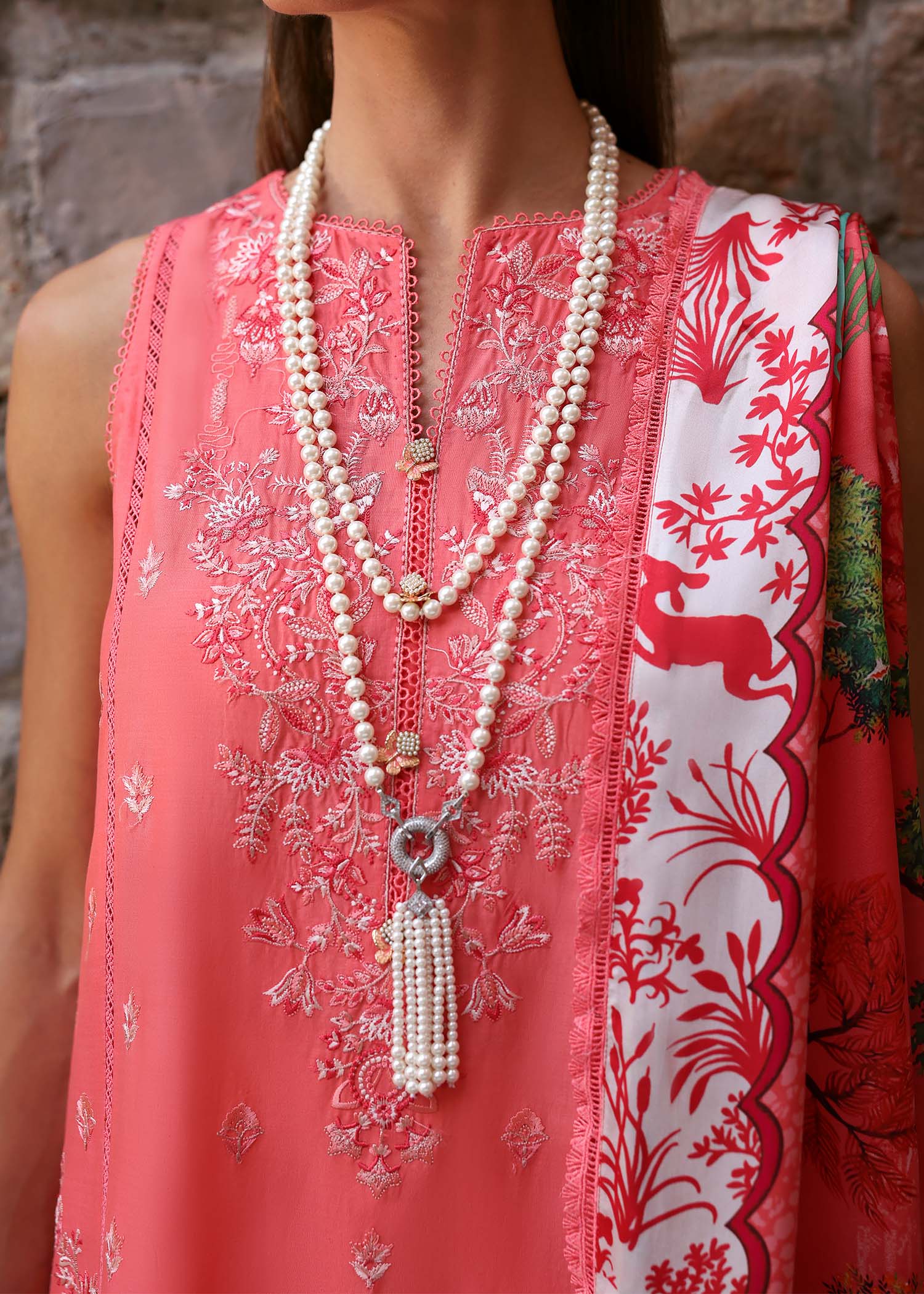Aanya , A radiant coral canvas, where the vibrant hue is brought to life with intricate embroidery, creating a captivating blend of texture and elegance. The design is elevated by embroidered side panels, adding depth and a modern edge. The look is beautifully completed with a digitally printed dupatta, showcasing tropical elements that infuse the ensemble with a fresh, exotic charm. Aanya is a seamless fusion of contemporary style and nature-inspired beauty, making it the perfect statement piece for any occasion.