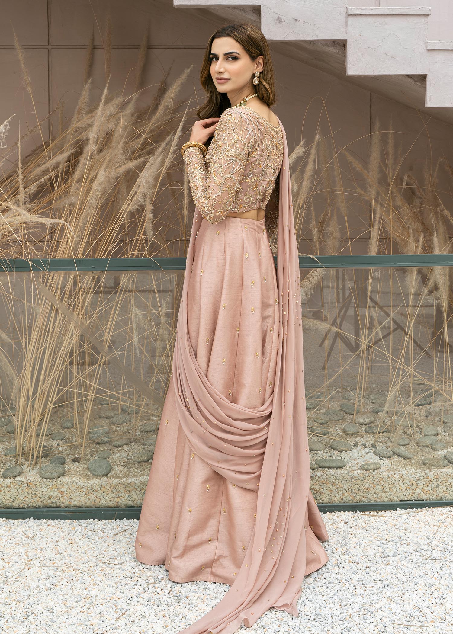 This exclusive ensemble is beautifully translated on a light hue of pink, which makes this draped lehenga choli standout in the crowd. Fully embellished organza choli is paired with a tint of sprayed motifs on lehenga. Perfectly draped chiffon dupatta completes the look of this outfit. Perfectly draped chiffon dupatta completes the look of this outfit which is attached to the lehenga.