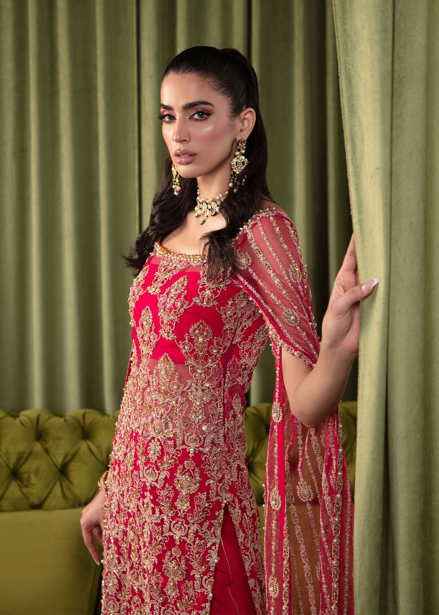 Embark on a journey to an enchanted realm with this ethereal ensemble, a fusion of fairy-like perfection and timeless elegance. Imagine a mesmerizing shocking pink long shirt adorned with intricate silvery lined motifs and a delicately scalloped hem, each detail crafted to captivate and charm. Picture cascading sequins, lustrous pearls, and glistening crystals adorning the fabric, creating a mesmerizing display of light and movement with every step you take. Completing this captivating look are cigarette pants in a complementary cherry hue, boasting side seam details that add a touch of sophistication and cohesion to the ensemble. Step into the spotlight and let your inner fairy shine with this exquisite ensemble, a testament to the boundless beauty of imagination and the enduring power of elegance.