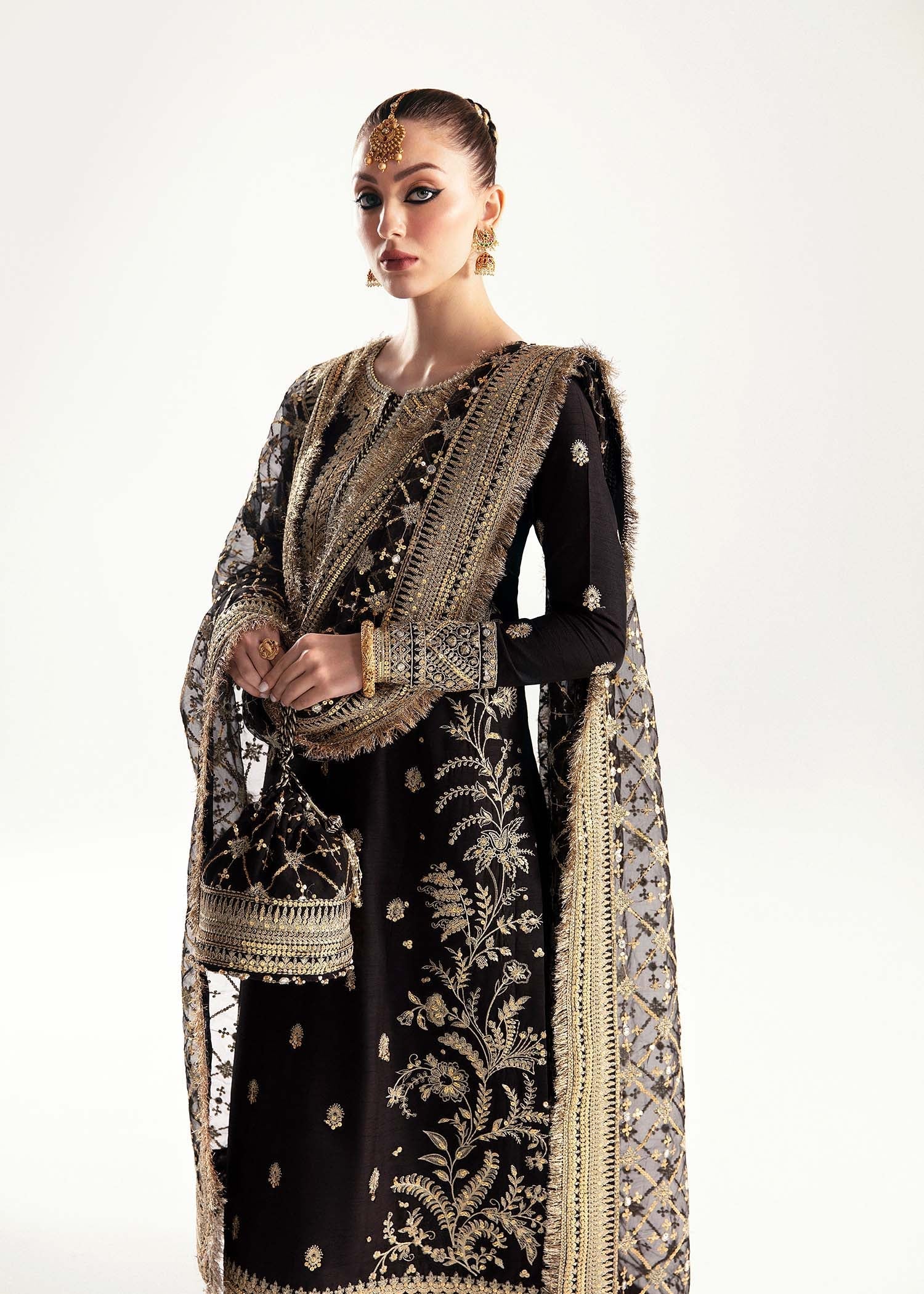 Step into the spotlight with our black Twin-sequined Korean Rawsilk Ensemble - a timeless blend of tradition and contemporary chic. Crafted from luxurious korean raw silk, the ensemble boasts a rich black hue, exuding sophistication and grace. The twin-sequined tilla embroidery adds a touch of opulence, catching the eye with every movement. Paired seamlessly with a chooridaar, this ensemble promises a flattering silhouette that effortlessly enhances your feminine charm. Elevate your look further with the ethereal Organza Twin-Sequined Panni Jaal Dupatta, adorned with intricate sequined patterns creating a mesmerizing play of light and shadow. This ensemble is not just an outfit; its a statement, perfect for weddings , festive celebrations, or any special occasion where you want to exude elegance and stand out in style.