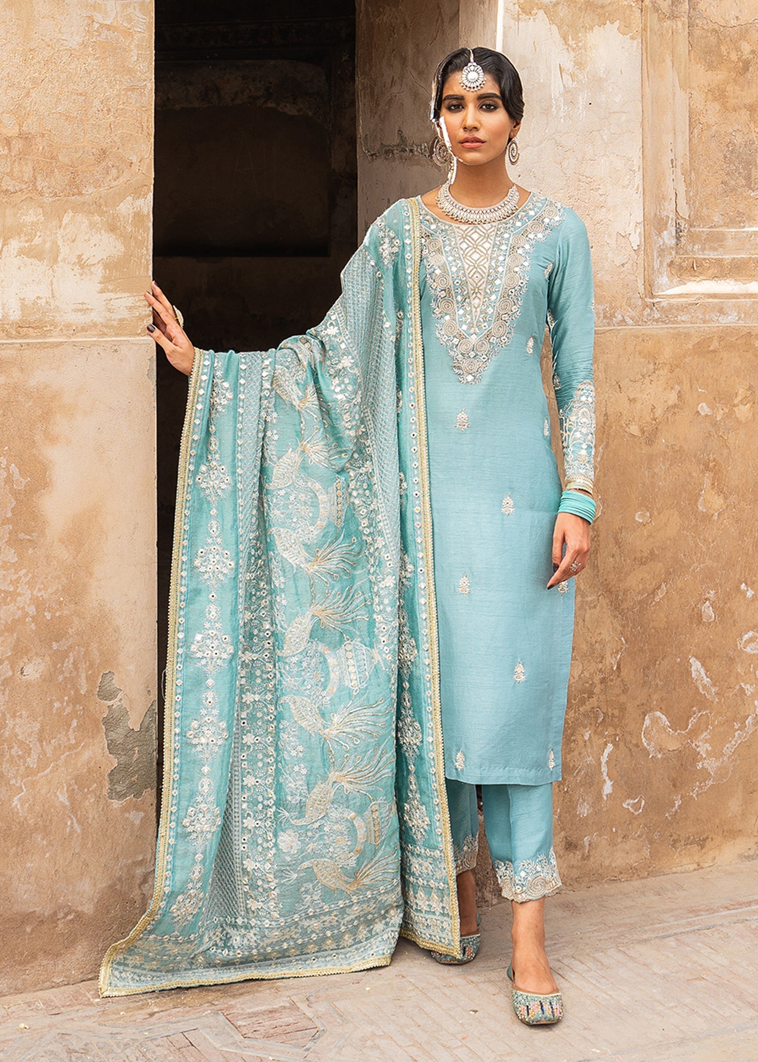 Like a mirage, crafted in an enchanting shade of azure, this breathtaking 3 piece is the epitome of regality. The stunning mirrorwork and embroidery on the neckline and sleeves enhances the sublime beauty of this outfit. It is paired with trousers with subtly embroidered borders. Synonmous to its name, the gloriously embellished dupatta with tilla and mirrorwork gives it an aura of royalty.