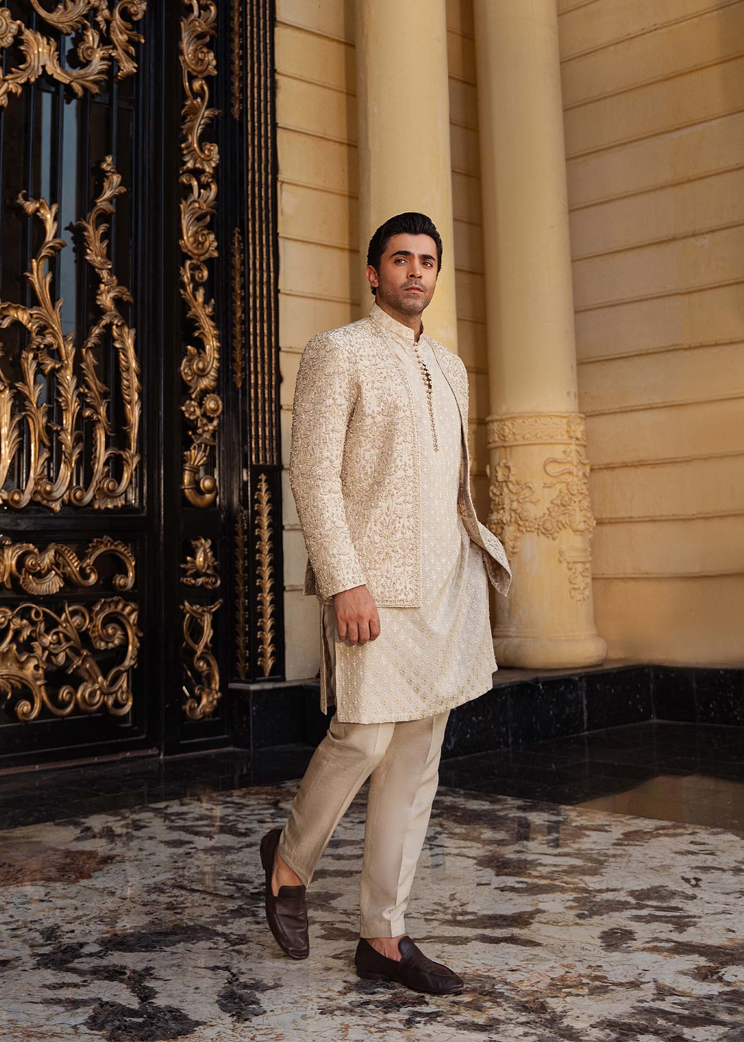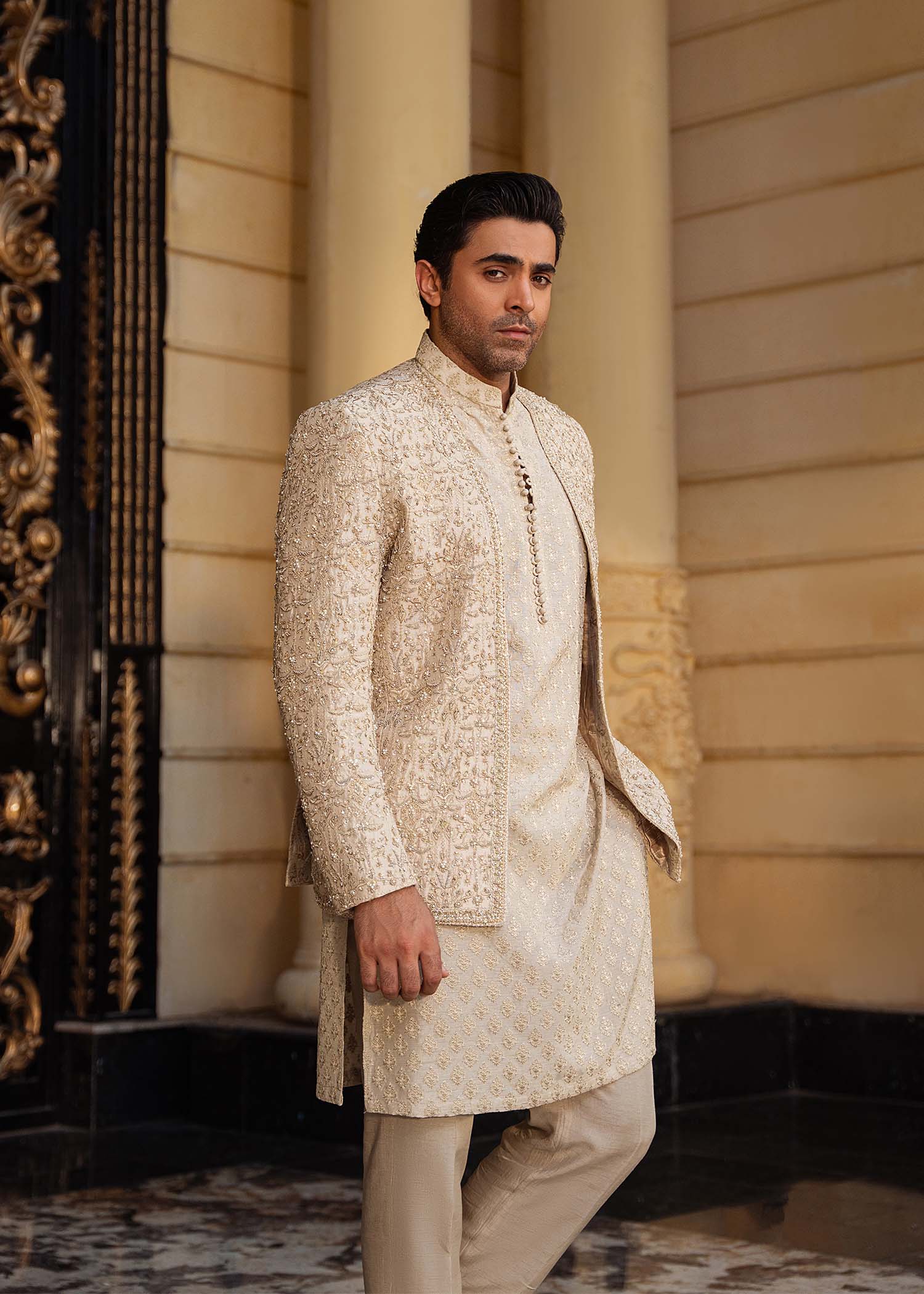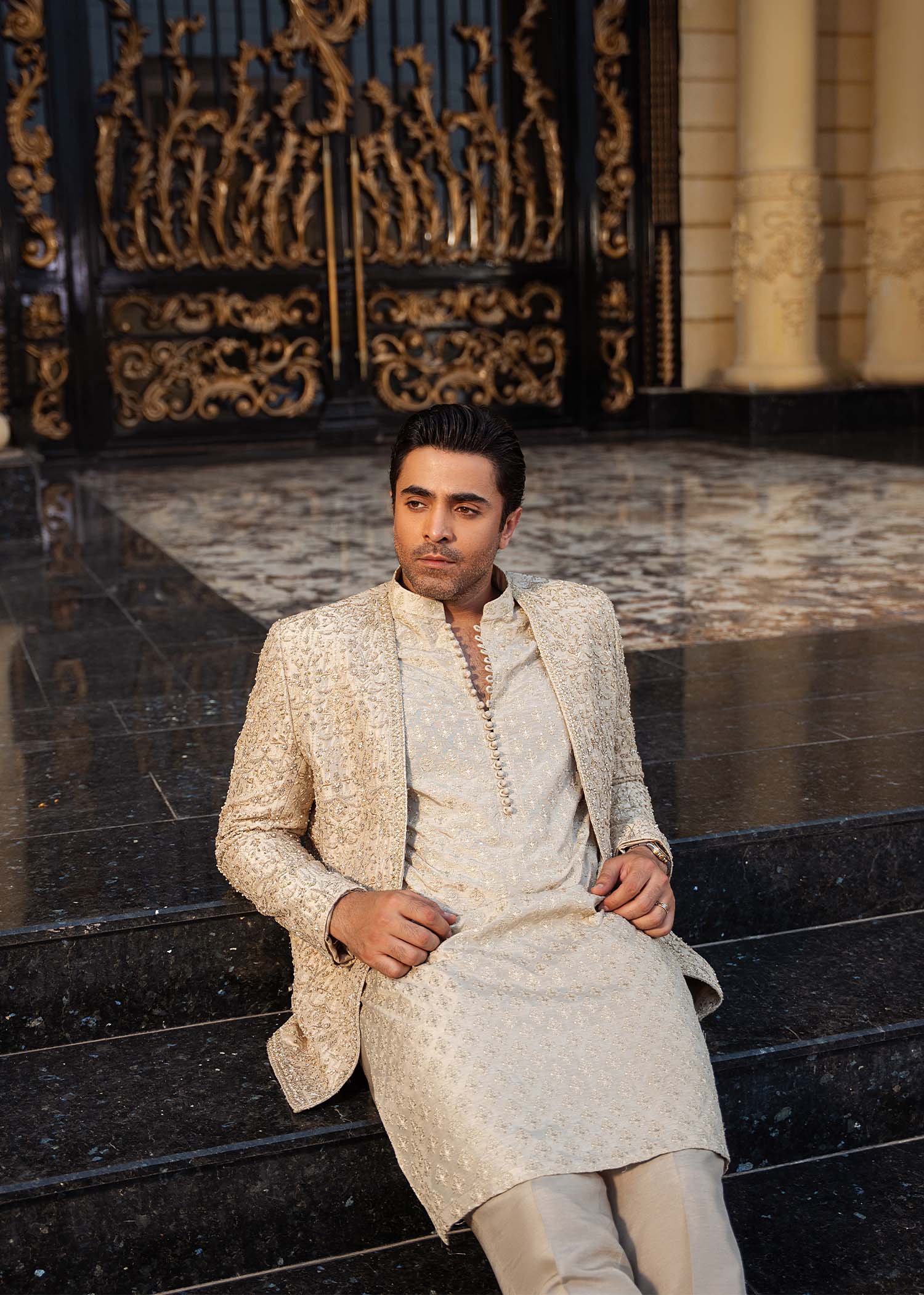 A statement-making golden front-open prince jacket crafted from luxurious pure raw silk. The sharp, modern cutline and striking gold-beige hue are elevated with intricate embroidery and exquisite embellishments. Paired with an elegantly embroidered inner kurta and plain tailored trousers, this ensemble perfectly balances opulence with contemporary sophistication.