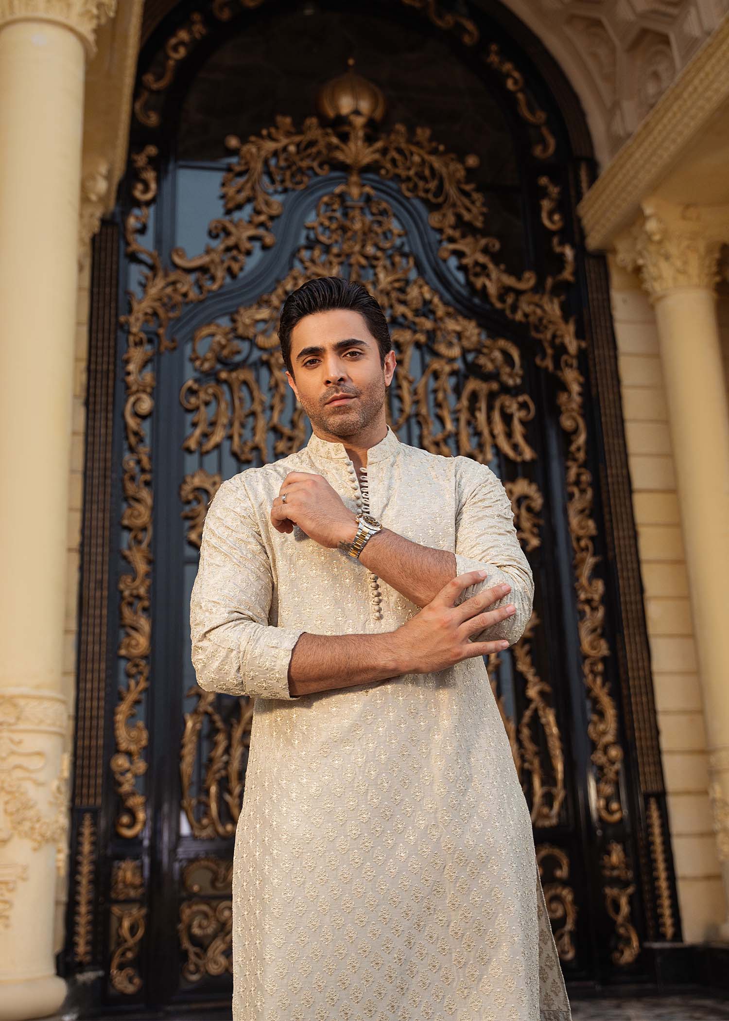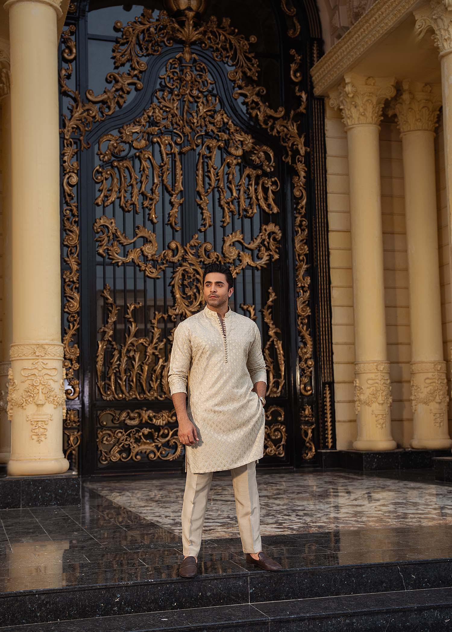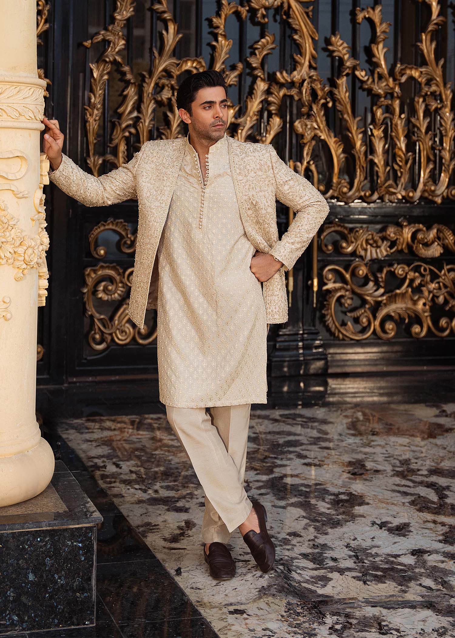 A statement-making golden front-open prince jacket crafted from luxurious pure raw silk. The sharp, modern cutline and striking gold-beige hue are elevated with intricate embroidery and exquisite embellishments. Paired with an elegantly embroidered inner kurta and plain tailored trousers, this ensemble perfectly balances opulence with contemporary sophistication.