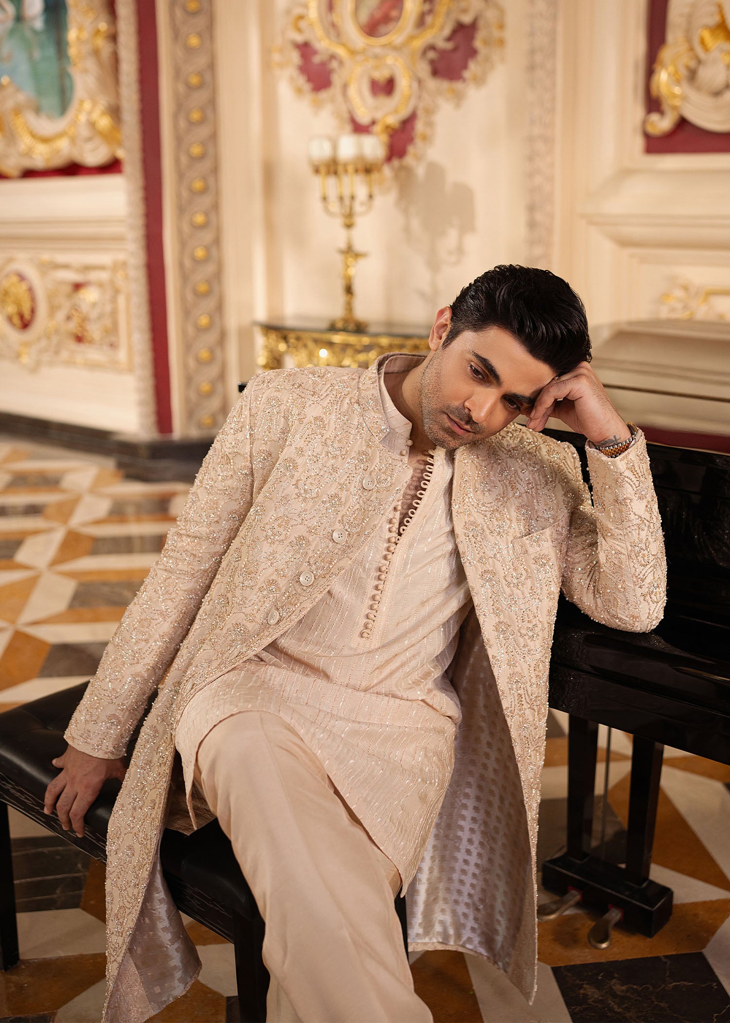 A refined rose gold raw silk sherwani, meticulously adorned with intricate embroidery and delicate embellishments. Paired with a matching embroidered kurta and plain trouser, this ensemble embodies timeless sophistication and understated royal charm.