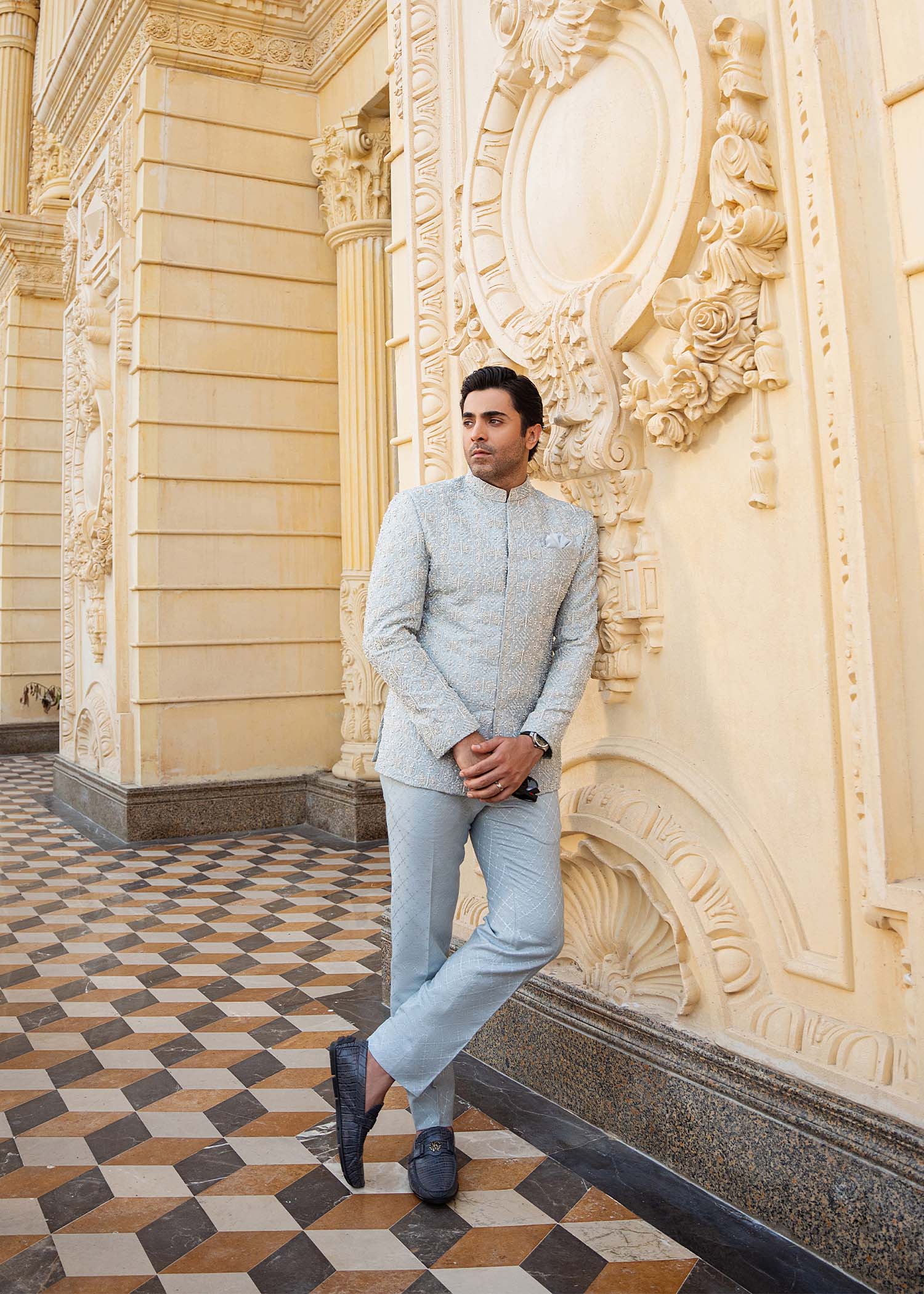 A striking powder blue raw silk prince jacket, fully embroidered and accentuated with dazzling silver embellishments. Paired with self-color krandi trousers, this ensemble blends refined craftsmanship with contemporary sophistication.