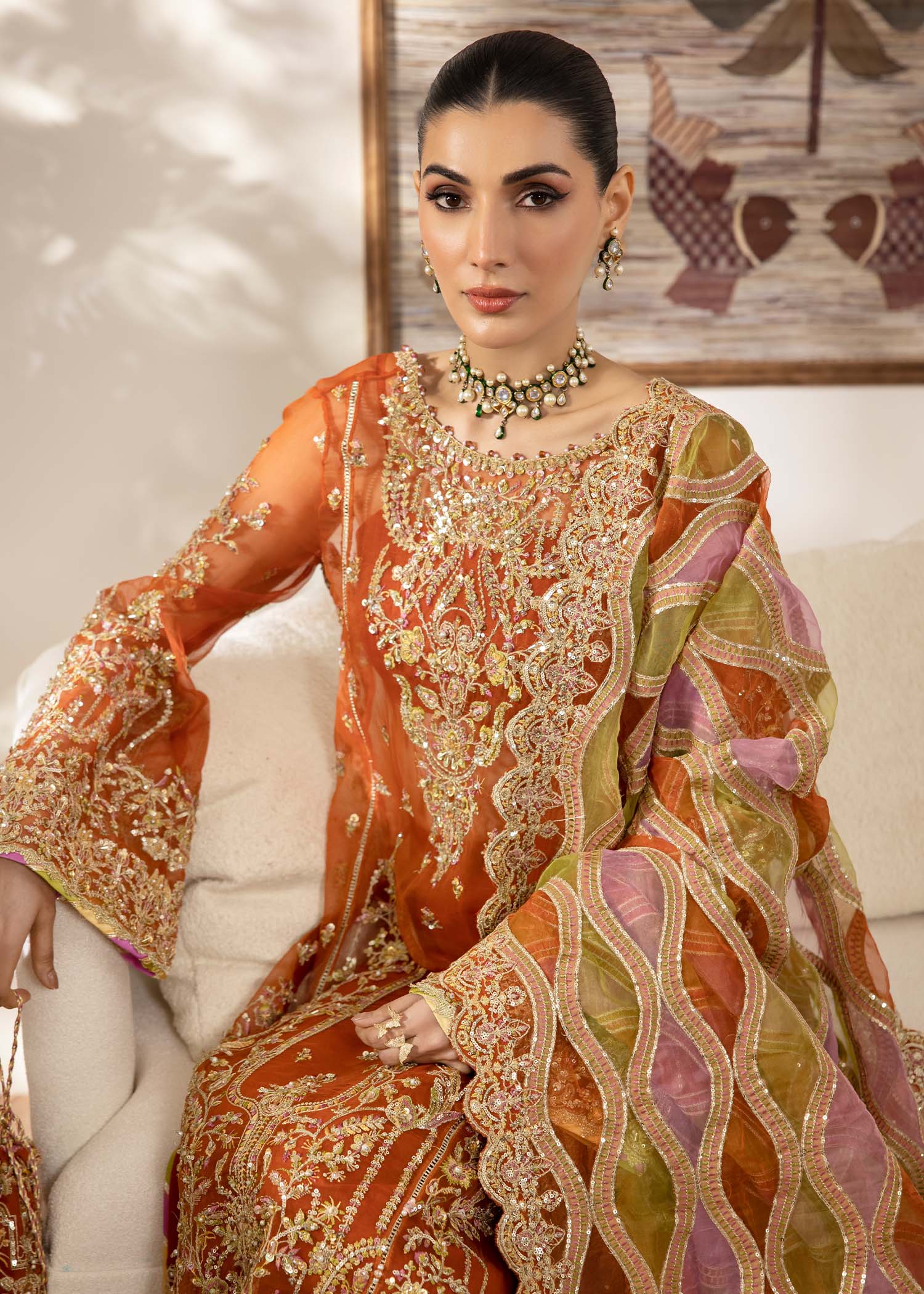 Roshail, A name that resonates with grace, modernity, and understated opulence—perfectly defines this exquisite ensemble, which masterfully blends time-honored craftsmanship with contemporary sophistication. The rust-hued short shirt is adorned with intricate chattapatti work, seamlessly infusing the design with rich, traditional artistry. Delicate lace accents further refine the garment, imparting an air of femininity and grace, while sculpting a flawless, elegant silhouette. The deep, earthy rust tone exudes warmth and refined charm, accentuating the meticulous craftsmanship and adding a sense of effortless luxury. Paired with the shirt are elegantly tailored culottes, their wide-leg cut offering an exquisite fusion of relaxed comfort and high-end chic. This modern, flattering fit ensures versatility, effortlessly transitioning from formal to semi-formal settings. Completing the ensemble is the striking multi-laser dupatta, its layered design infusing the look with dynamic depth and fluid movement, creating a compelling contrast against the solid rust of the shirt.