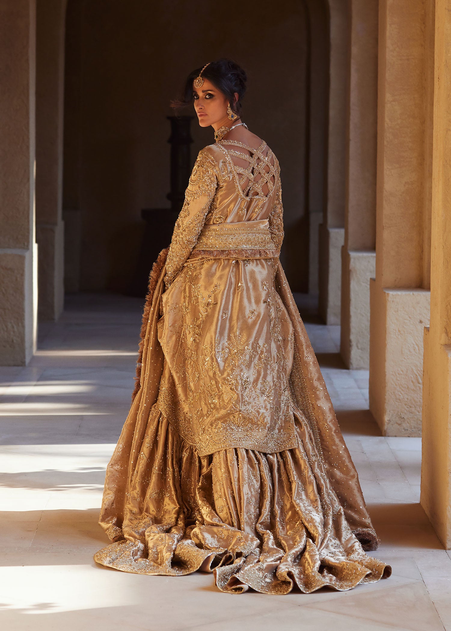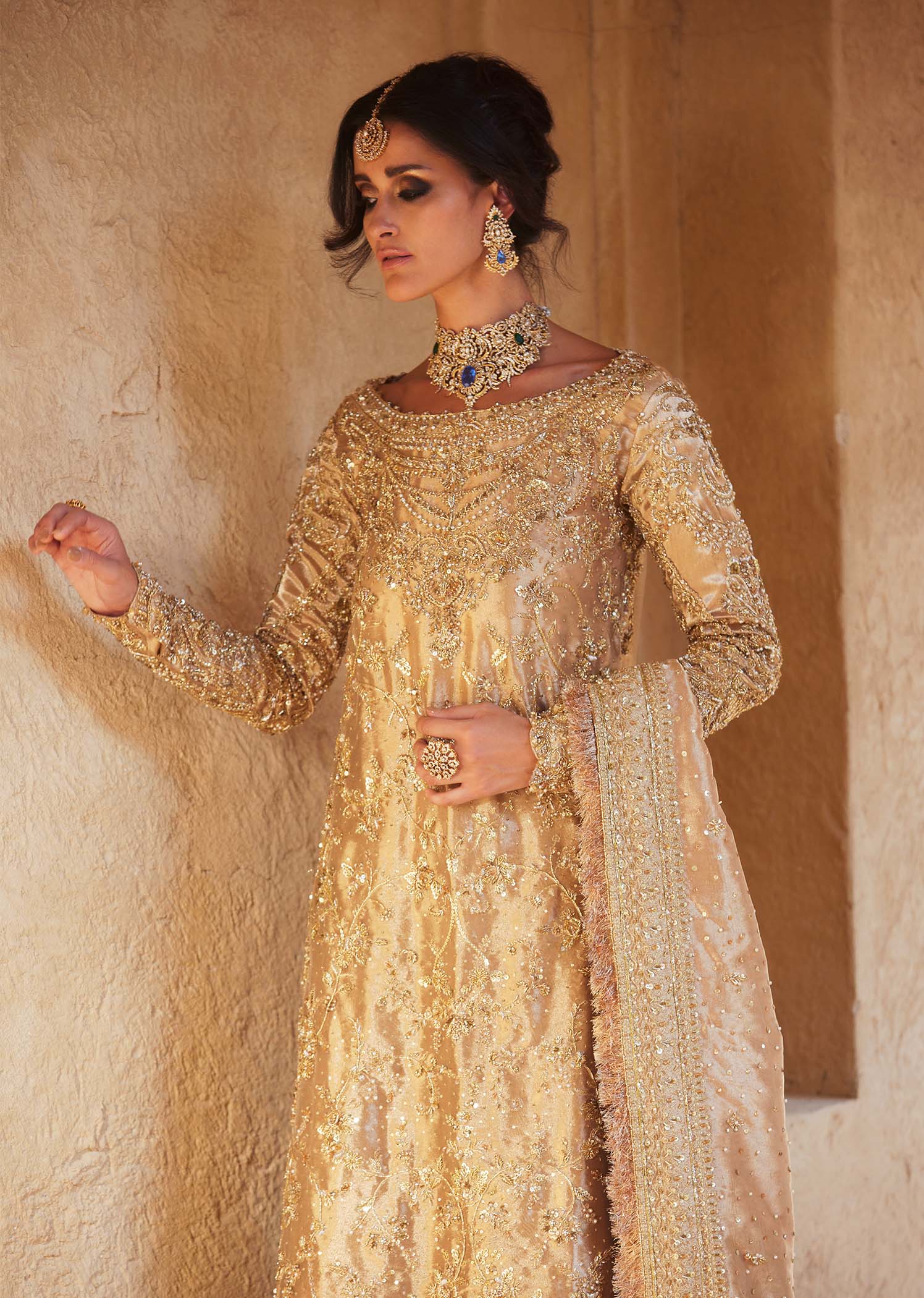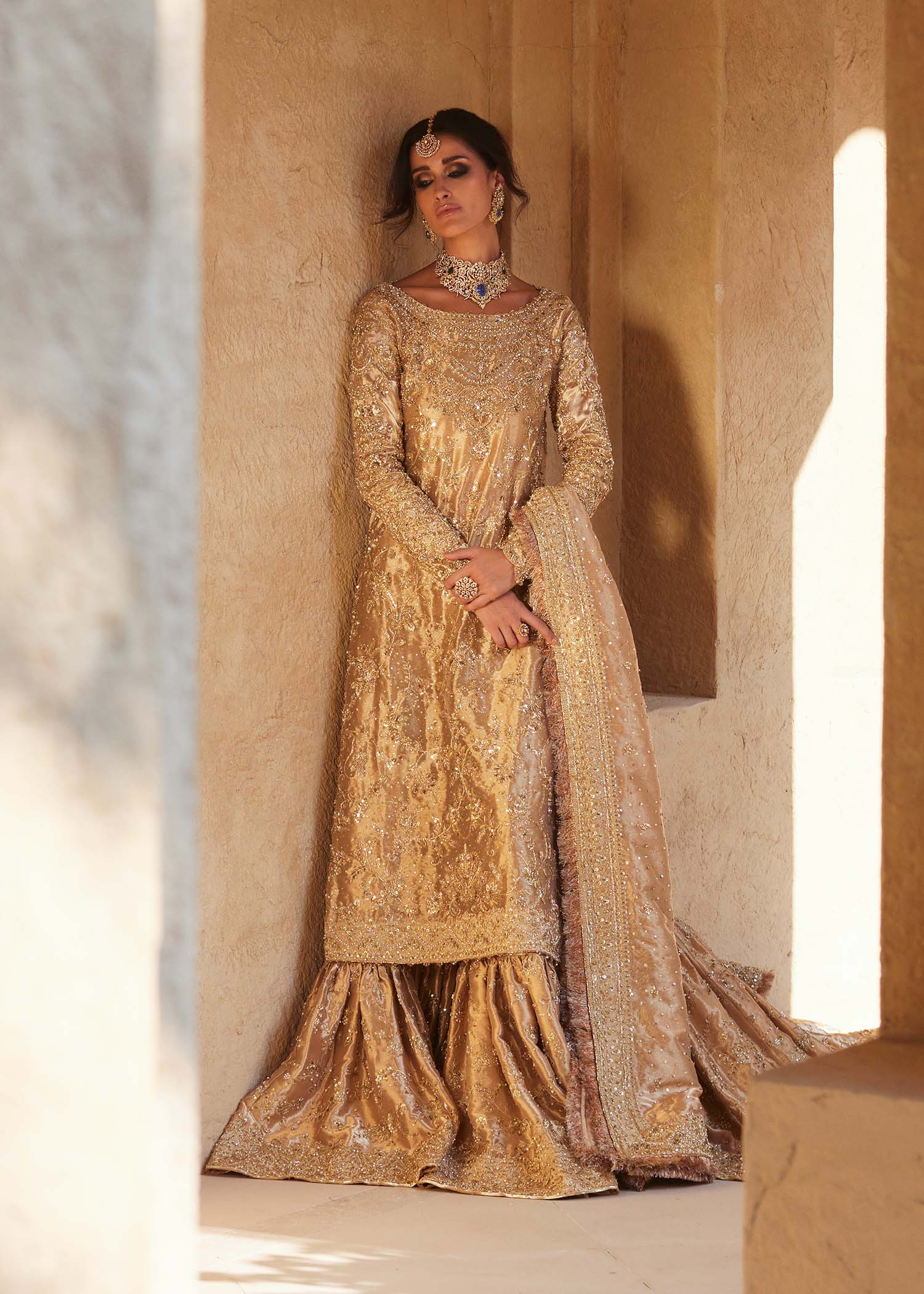 A vision of royal splendor, Arla shines in luminous gold where masterful handcraftsmanship meets regal design. The flowing long pure gold tissue shirt paired with a majestic farshi gharara creates a grand, harmonious silhouette, elevated with a classic double dupatta. Layered gold embellishments in varying tones add depth and richness, making Arla a timeless statement of heritage artistry and refined bridal luxury.
