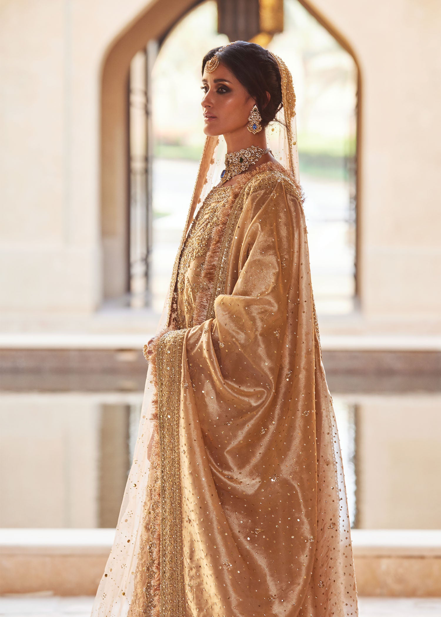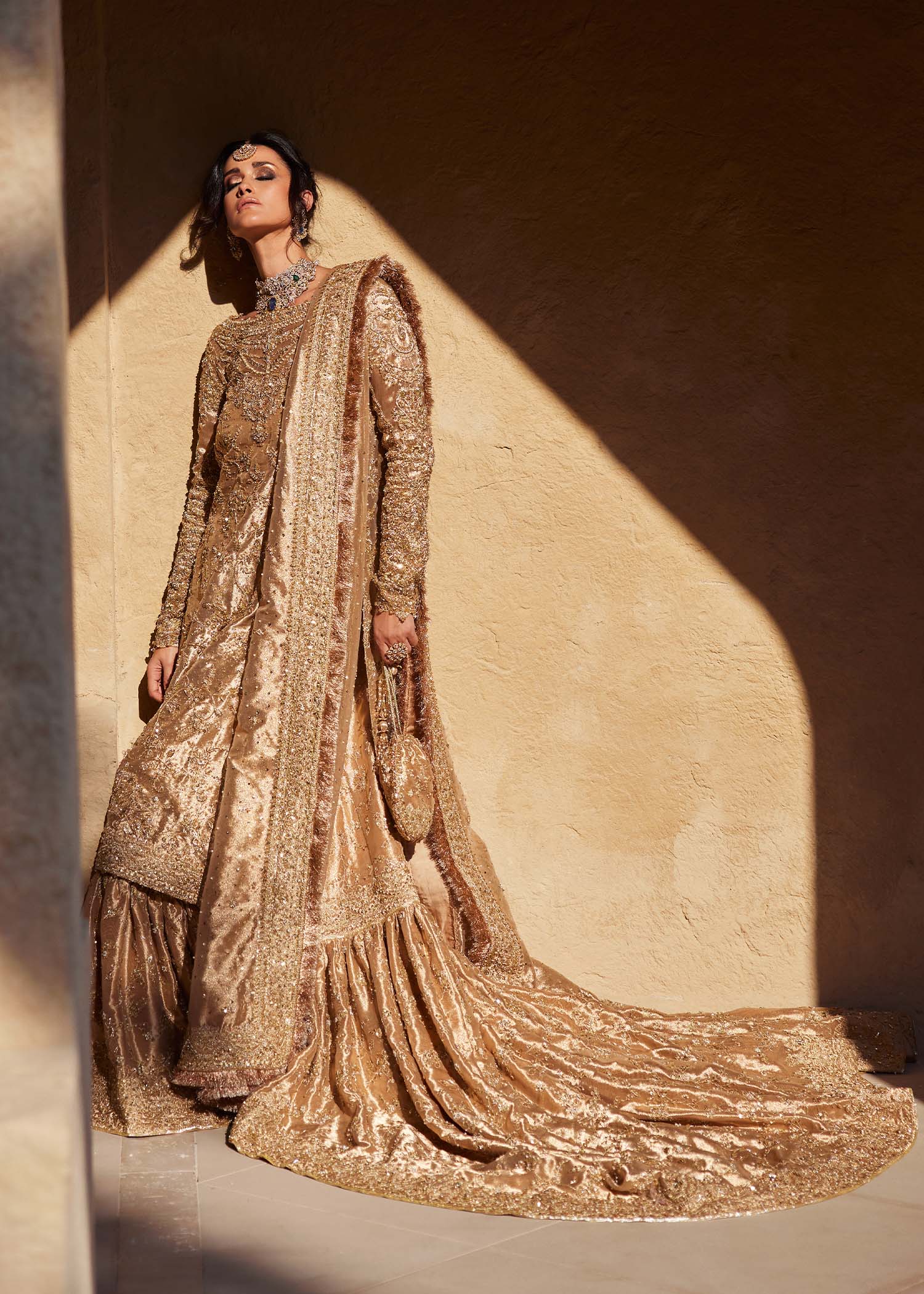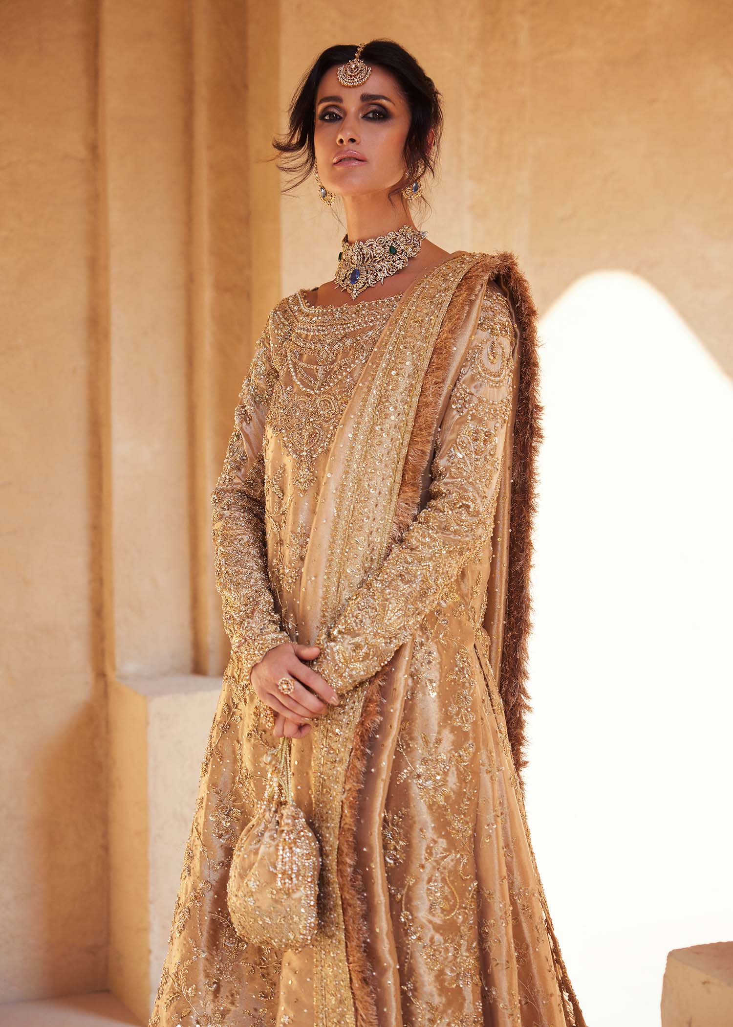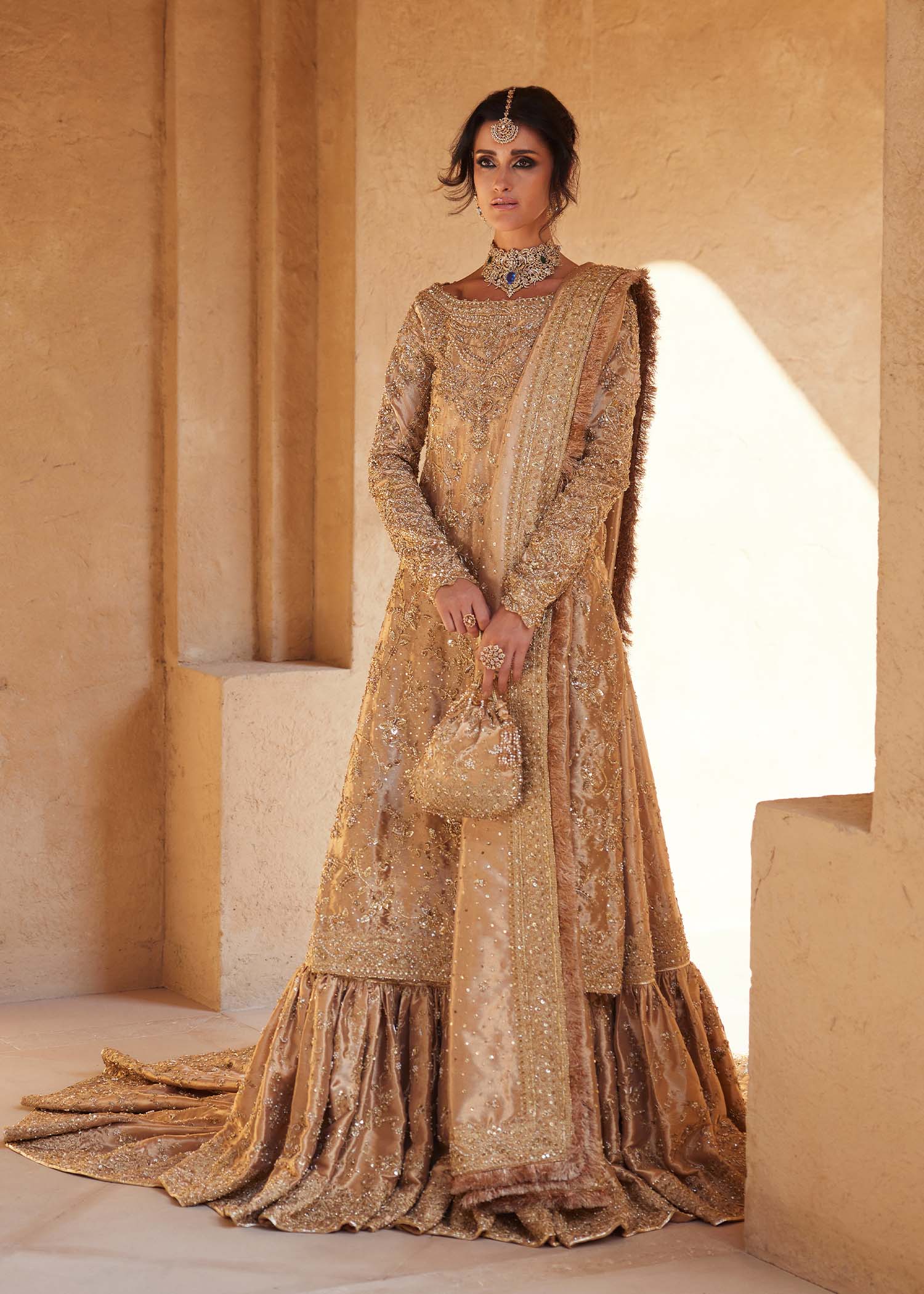 A vision of royal splendor, Arla shines in luminous gold where masterful handcraftsmanship meets regal design. The flowing long pure gold tissue shirt paired with a majestic farshi gharara creates a grand, harmonious silhouette, elevated with a classic double dupatta. Layered gold embellishments in varying tones add depth and richness, making Arla a timeless statement of heritage artistry and refined bridal luxury.