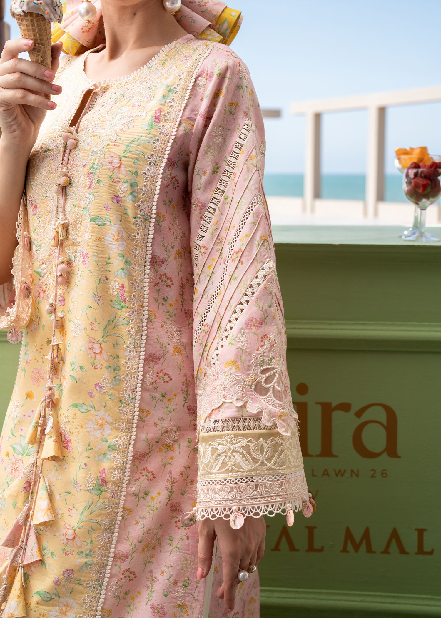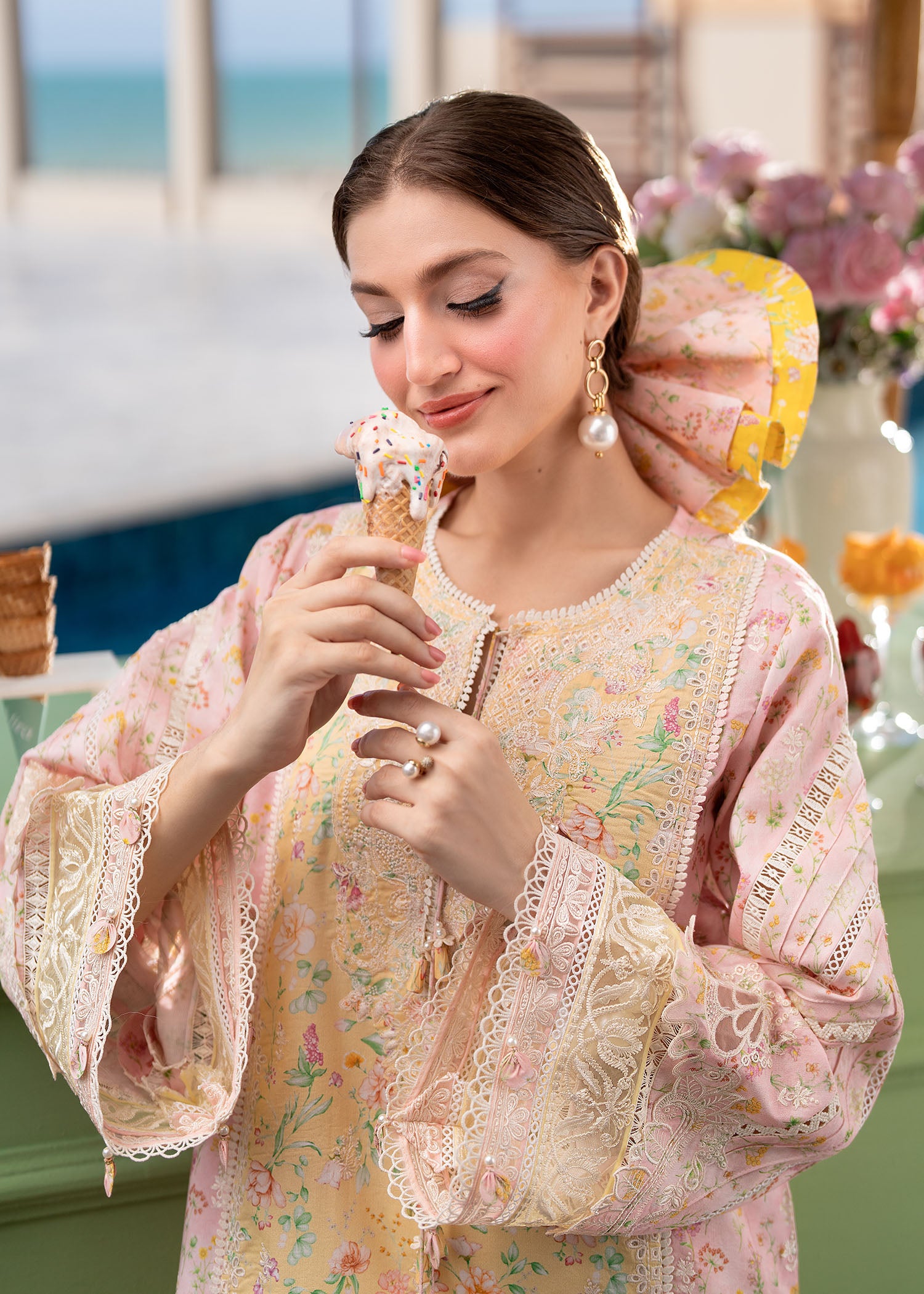 A vibrant fusion of pink and yellow, “Mila” is a lively expression of modern artistry, featuring a beautifully composed embroidered and printed lawn front with striking center and side panels that create a bold yet graceful silhouette. The design is elevated with an intricately detailed organza neckline and refined panel patches that add depth and dimension, while delicately embroidered sleeves and coordinated borders enhance its elegance. Paired with a flowy digital printed chiffon dupatta and a classic cambric base, Joona beautifully blends playful color tones with timeless sophistication.