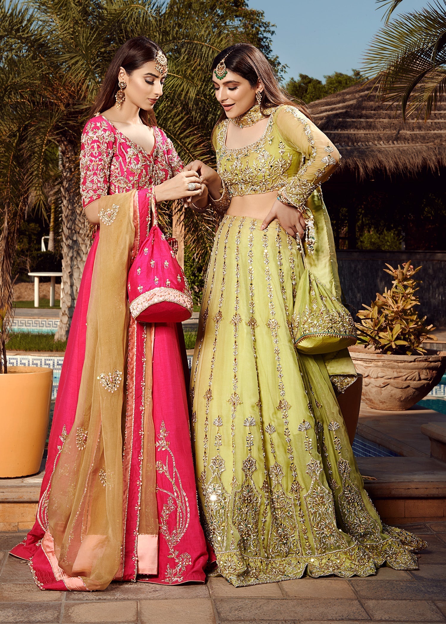A hot pink lehenga choli creates aesthetic magic with its intricate hand work on korean silk fabric, Lehenga has hand embellishment on front and back ghera, paired with hand made tassels on the belt.The handcrafted dupatta is finished with our signature detailing. The shirt is completed with a beautifully detailed and embellished border with Kora,dabka, kulfi, nakshi, pearls and sitara.