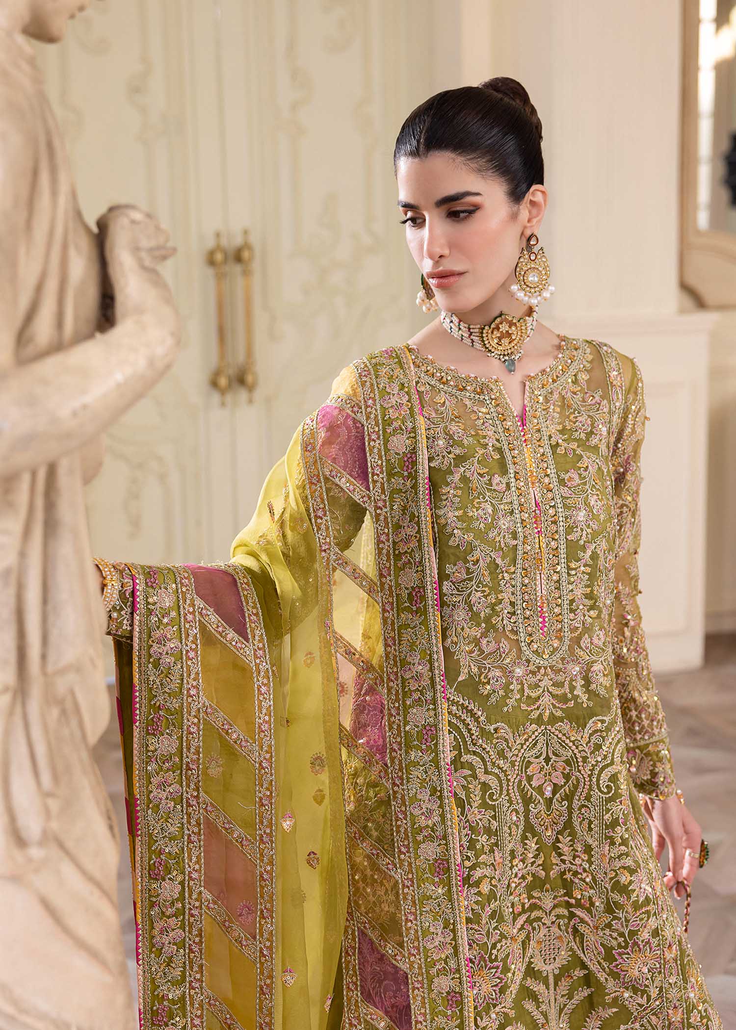 The olive green shirt exudes regal allure, its intricate embroidery and shimmering embellishments catching the light with every step you take. Delicate motifs and intricate designs adorn the fabric, creating a mesmerizing tapestry of beauty that commands attention and admiration. The stunning masterpiece, has embroidery and embellishments that glisten with every step. This traditional outfit is paired with detailed laser work and embroidered spray dupatta completing the stunning outfit. Step into the spotlight and leave a trail of awestruck admirers as your flaunt this outfit. Enhancing the ensemble's allure is the four-side laser border dupatta, a true work of art that completes the look with its intricate detailing and mesmerizing beauty. The laser-cut patterns add depth and dimension to the dupatta, creating a captivating visual impact, while the rich olive green hue complements the embroidered shirt perfectly. the crushed pants, offering both comfort and style, while the relaxed fit ensures ease of movement.