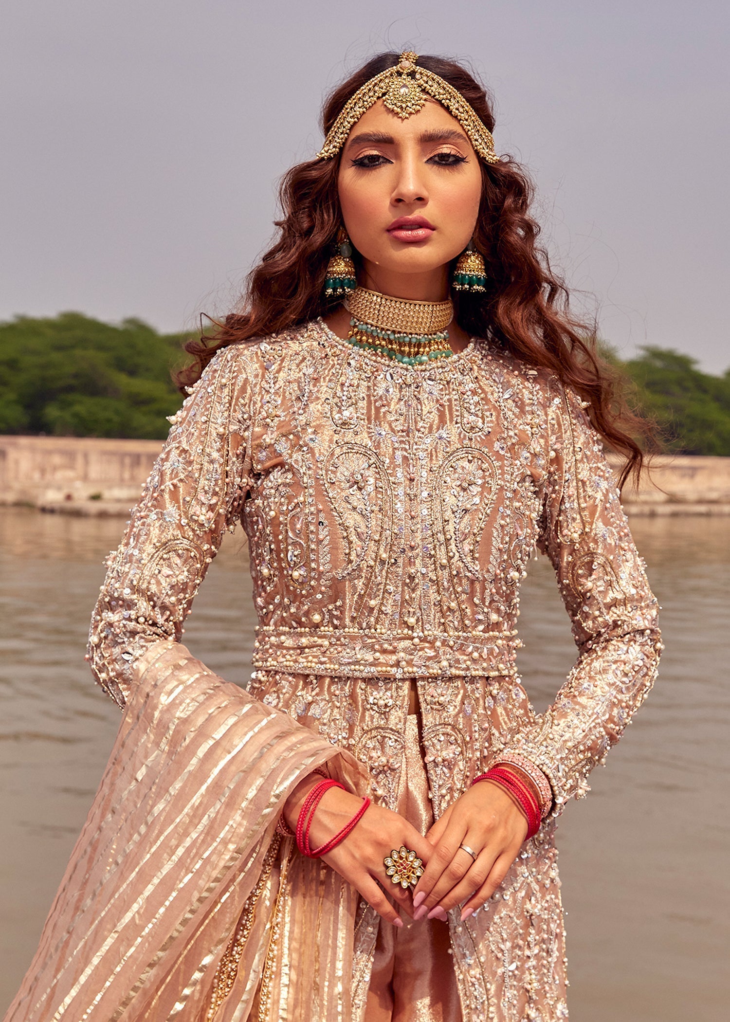 It is a 4 piece stitched outfit including shirt, slip, trouser and dupatta. Fabric for shirt is pure tissue with front and sleeves fully hand embellished. The outfit is paired with tissue flared pants with laces on the bottom. Organza badla fabric is used for dupatta which is adorned with laces on all four sides.