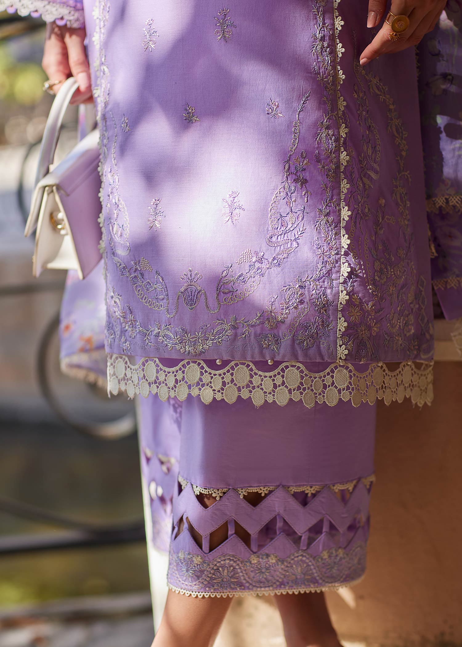 Embrace a serene aesthetic with this lilac ensemble, where refined craftsmanship meets contemporary allure. The embroidered lawn shirt is adorned with exquisite white threadwork and delicate lace trims, while statement cut-out detailing on the sleeves adds a distinctive touch to its clean, structured silhouette. Elegantly paired with a printed silk dupatta, the look is elevated with fluid sophistication and understated luxury. Completed with matching cambric trousers, this ensemble balances subtle complexity with modern elegance, making it a graceful choice for both daytime wear and refined gatherings.