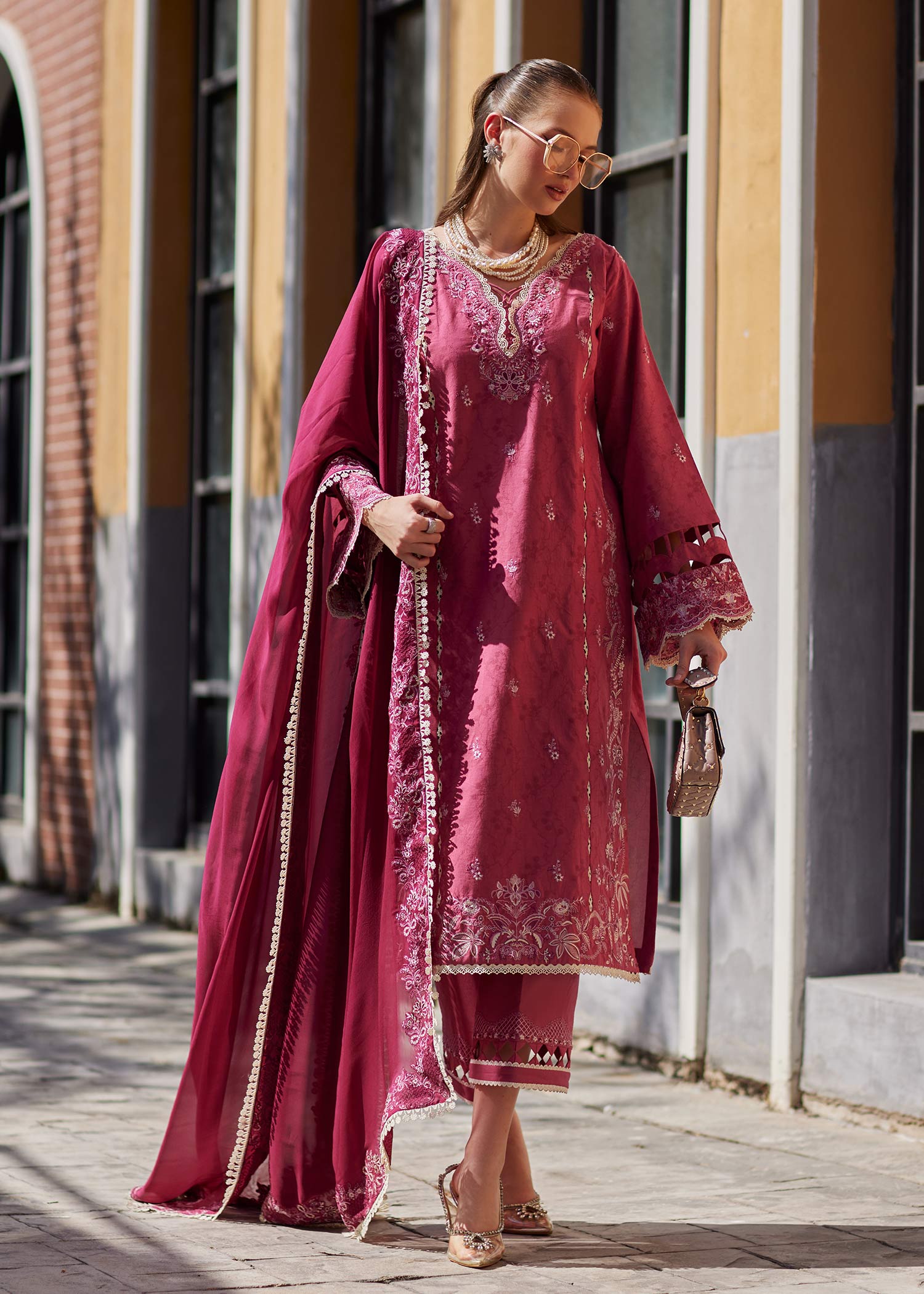 This rich-toned fuchsia pink dobby ensemble is a striking expression of elegance and modern refinement. The embroidered dobby shirt features intricate motifs and statement borders that add depth and character to its classic silhouette, creating a look that feels both graceful and contemporary. Paired with a lightweight contrasting chiffon dupatta that drapes effortlessly, the ensemble gains a sense of softness and fluid movement. Finished with a matching cambric trouser detailed with a embroidered border, this design is ideal for elevated daywear and intimate festive occasions, offering timeless charm with a polished finish.